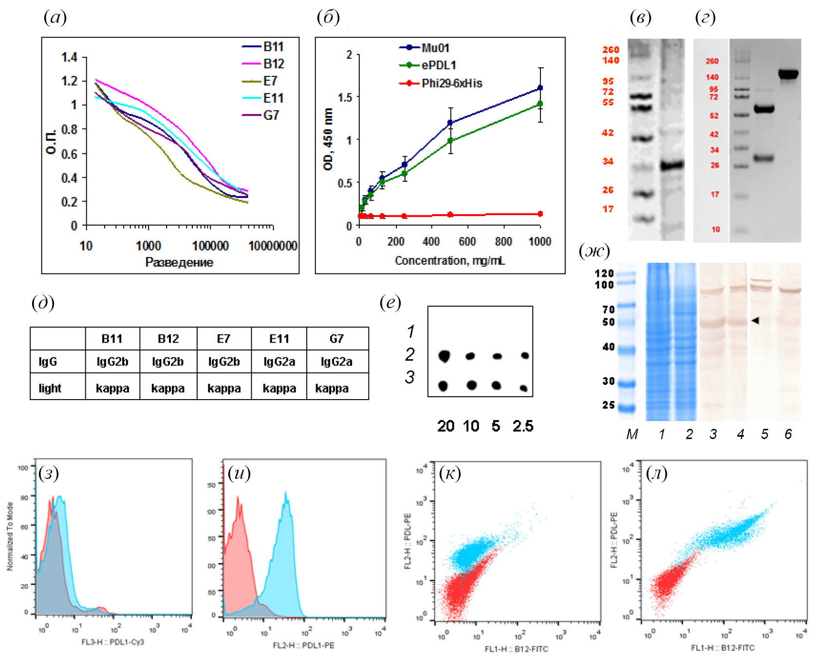 Рис. 2. Характеристика моноклональных антител к exPD-L1, продуцируемых полученными гибридомами. (а) – Связывание белка exPD-L1 антителами из культуральной жидкости полученных гибридом методом ИФА; (б) – распознавание белков внеклеточной части PD-L1 (exPD-L1 и RPA788Mu01) и белка сравнения (ДНК-полимераза фага Phi29 с 6xHis тагом) мАт, выделенными из асцитной жидкости гибридомы B12; (в) – электрофореграммы белка RPA788Mu01 и (г) очищенных мАт В12 в восстанавливающих и невосстанавливающих (слева направо) условиях; (д) – изотипирование мАт, секретируемых полученными гибридомами; (е) – распознавание мАт гибридомы В12 в дот-блоте ДНК-полимеразы фага Phi29-6xHis (1), exPD-L1 (2) и RPA788Mu01 (3) (слева направо уменьшающаяся концентрация белка); (ж) – электрофореграммы и вестерн-блот лизатов клеток мыши B16/F10 (1, 3, 5) и человека SCOV-3 (2, 4, 6), меченные антителами В12 против PD-L1 мыши (3, 4) и против двух форм белка теплового шока 70 (конститутивная и индуцируемая формы) (5, 6); (з) – гистограммы распределения живых клеток EL-4, окрашенных B12-Cy3 и (и) 10F.9G2-PE. Розовым цветом отмечены контрольные гистограммы, голубым отмечены клетки после связывания с антителами; (к) – дот-плоты живых и (л) пермиабилизованных клеток B16/F10, (ж, абсцисса) – меченных B12 или 10F.9G2 (ордината). Розовым цветом отмечены контрольные гистограммы, голубым отмечены клетки после связывания с антителами.