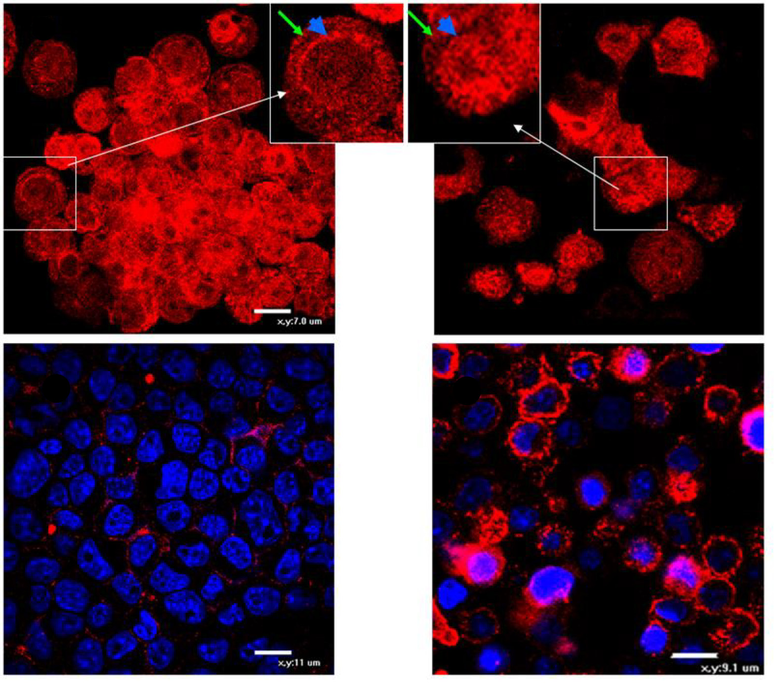 Для проточной цитометрии и конфокальной микроскопии клетки инкубировали как описано выше. Для получения пермиабилизированных клеток использовали 0.1% тритон X100 в PBS. Для конфокальной микроскопии клетки высевали на покровные стекла, инкубировали 3–4 ч для достижения адгезии, пермиабилизовали и окрашивали антителами.
