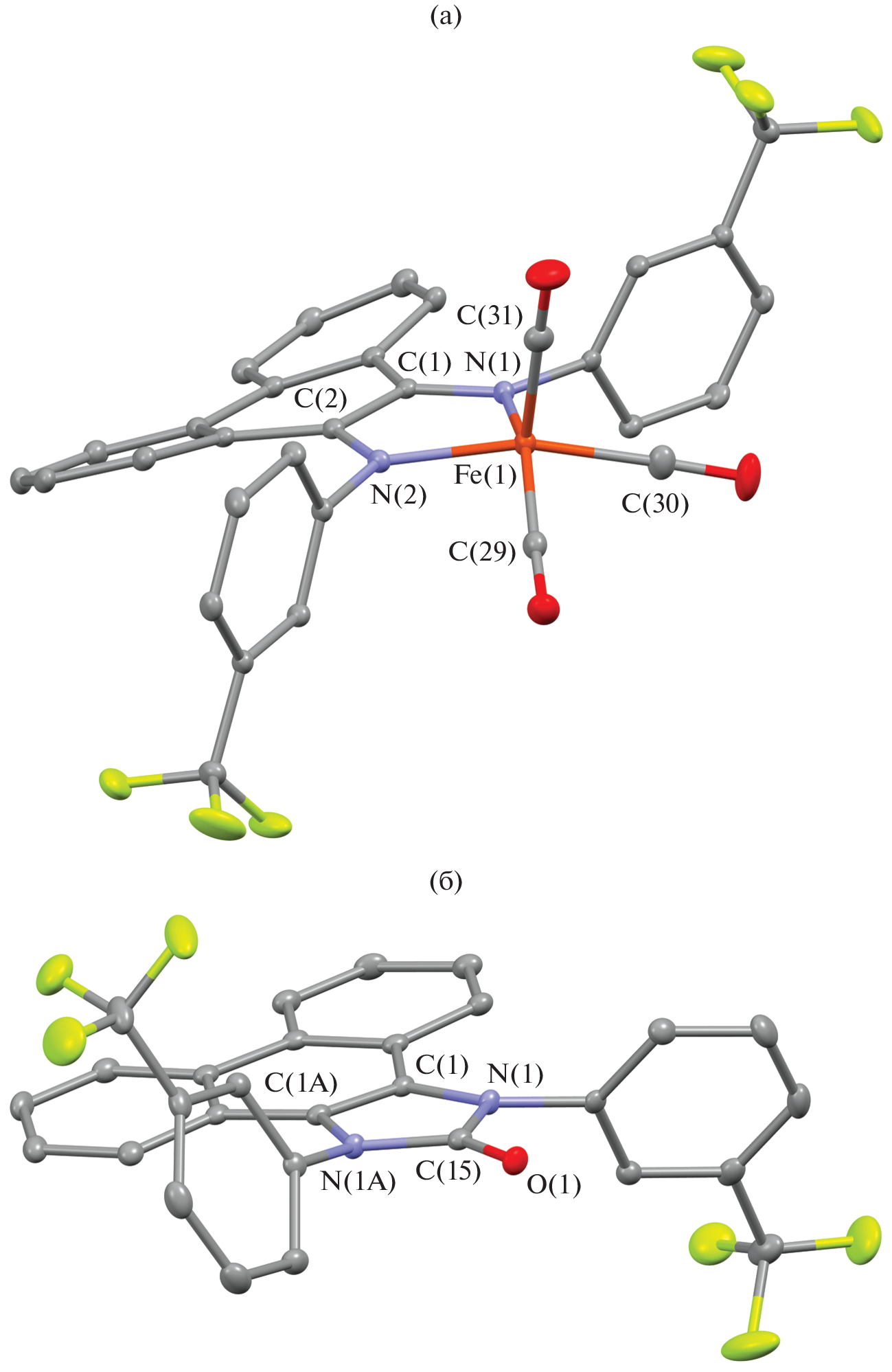 The oxidative addition of N,N'-disubstituted phenanthrenediimines to iron carbonyls was studied. The reactions of acceptor phenanthrenediimines with Fe2(CO)9 give iron(I) tricarbonyl complexes with anion-radical forms of the ligands. The synthesized compounds were characterized by NMR and IR spectroscopy. The structures of the complex based on N,N'-bis(3-trifluoromethylphenyl)phenanthrenediimine and imidazol-2-one ligand was established by X-ray diffraction (XRD) (CIF files СCDC nos. 2173471 and 2173472, respectively).