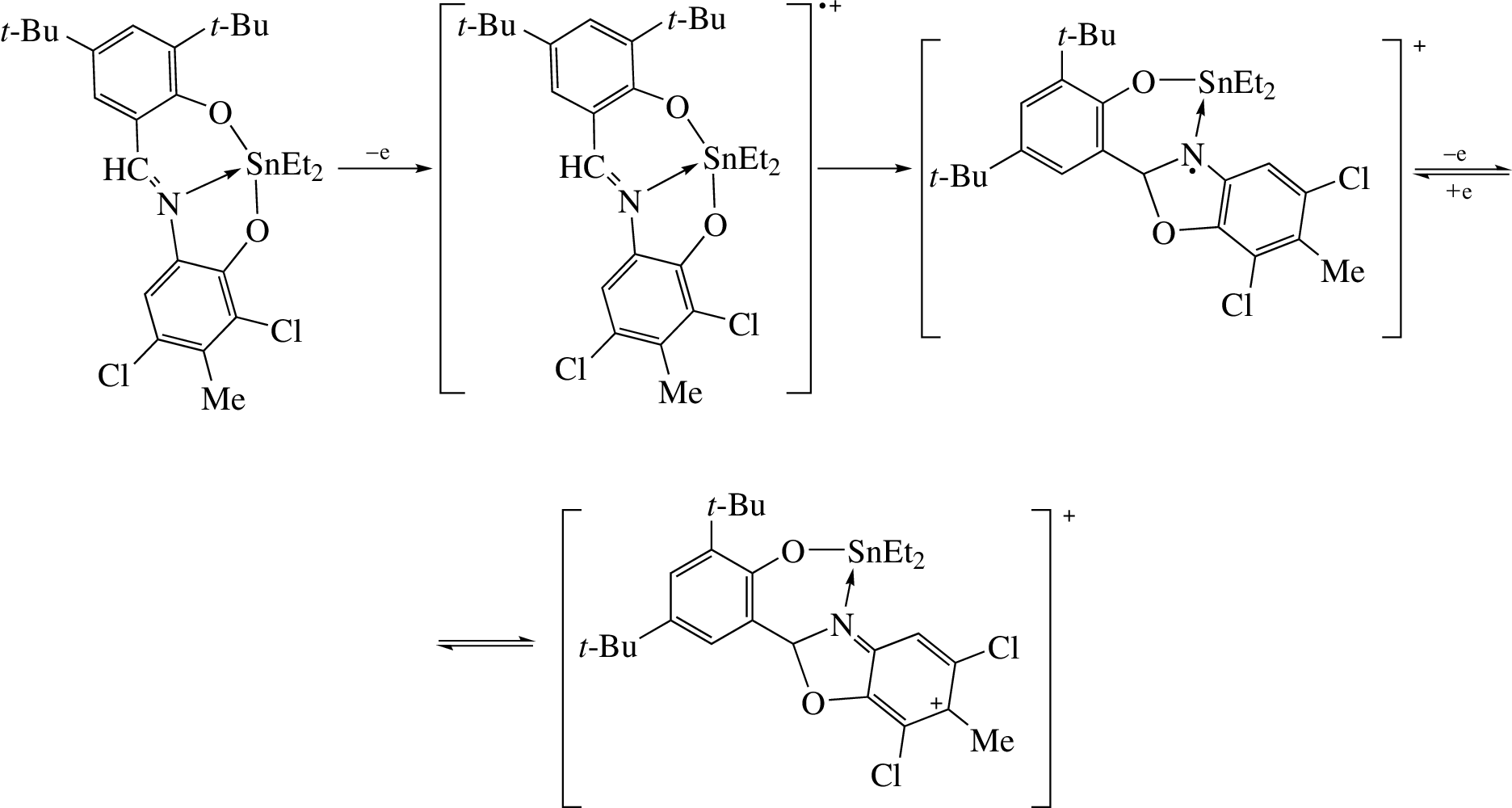 New tin(IV) complexes with O,N,O'-donor Schiff bases (L1H2–L4H2) of the (Ln)SnR2 type (R = Ph (I–III), Et (IV–VII)) are synthesized and characterized. The molecular structures of compounds I–III, VI, and VII in the crystalline form are determined by X-ray diffraction (XRD) (CIF files CCDC nos. 2181140 (I), 2181142 (II), 2181143 (III∙CH3CN), 2181141 (VI), and 2181139 (VII)). Tin complexes I–III and VI are mononuclear pentacoordinate compounds. Crystalline complex VII forms dimers via the pairwise bridging coupling between the oxygen and tin atoms of the mononuclear fragments. The redox-active ligand in the synthesized compounds exists as the iminobis(phenolate) dianion. The electrochemical properties of free ligands and complexes I–VII are studied. In the case of compounds I, II, IV, and V with tert-butyl substituents in the redox-active ligand, the formation of relatively stable monocationic and monoanionic species is electrochemically detected for the first time. The presence of the electroactive nitro group results in the destabilization of the oxidized forms of the complexes and induces the appearance of an additional peak in the cathodic range. The energy gaps between the frontier redox orbitals are determined by the electrochemical and spectral methods. The obtained parameters are close and vary in a range of 2.43–2.68 eV.