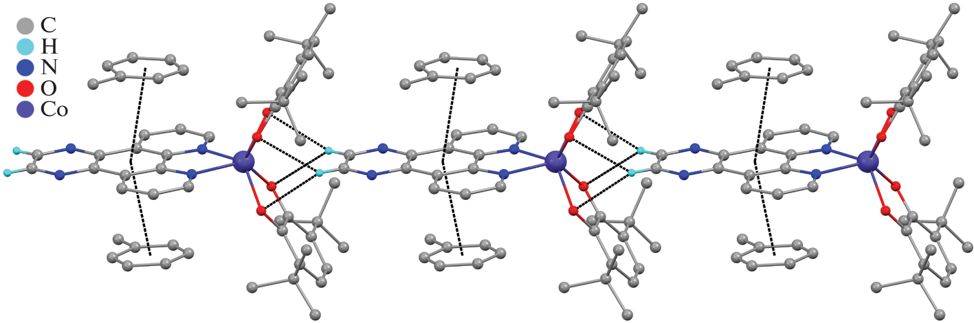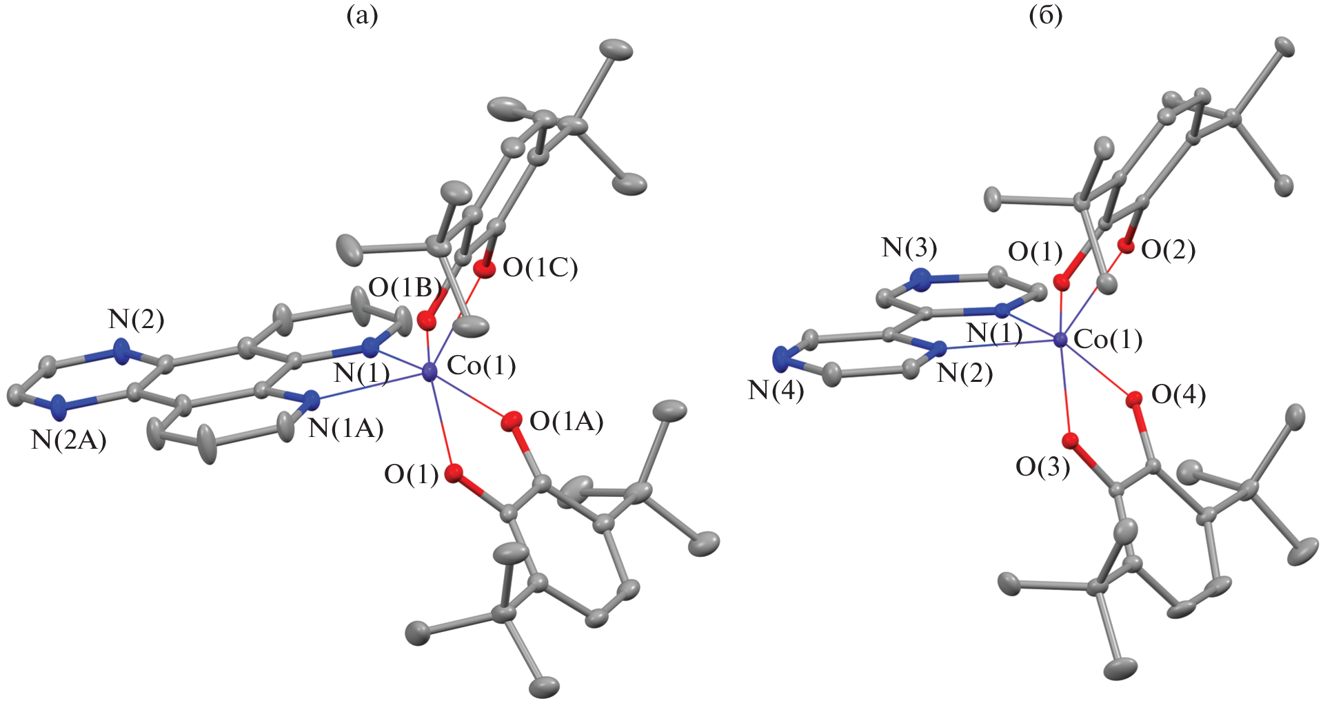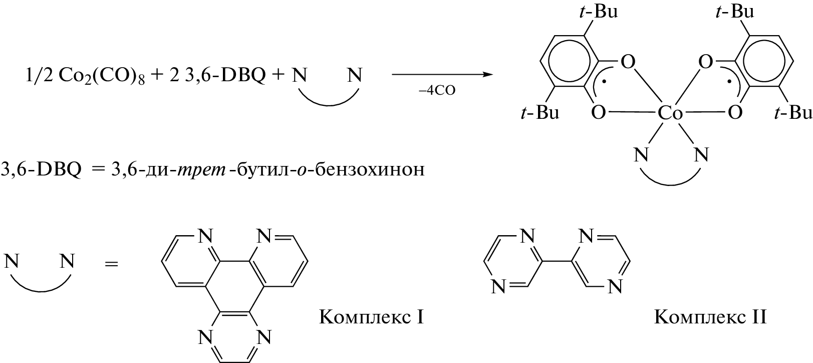 Two new cobalt bis-o-semiquinonato complexes, (Pyz-Phen)Co(3,6-DBSQ)2 (I) and (Bpyz)Co(3,6-DBSQ)2 (II) (Pyz-Phen = pyrazino[2,3-f][1,10]phenanthroline, Bpyz = bipyrazine, 3,6-DBSQ = 3,6-di-tert-butyl-o-benzoquinone radical anion), were synthesized. According to X-ray diffraction data, both complexes have a trigonal-prismatic geometry of the inner coordination sphere. The distribution of C–O and Co–O bond lengths, which reflects the valence state of the metal and the ligands, indicates that the complexes are formed by cobalt(II) surrounded by two semiquinone radical anions. The results of magnetochemical measurements show that the pyrazino[2,3-f][1,10]phenanthroline complex is a derivative of low-spin divalent cobalt, whereas its bipyrazine structural analogue is a high-spin cobalt(II) derivative.