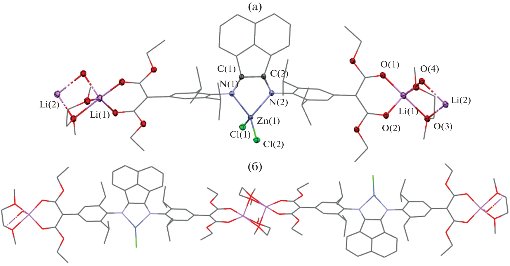1,2-Bis[(2,6-diisopropyl-4-diethylmalonophenyl)imino]acenaphthene (Dem-Bian) with zinc chloride forms complex [(Dem-Bian)ZnCl2] (I). The reaction of complex I with n-BuLi proceeds with the deprotonation of the malonate fragments and gives 1D coordination polymer [ZnCl2(Dem-Bian)Li(DME)2]n (II). The reaction of [(Dem-Bian)CuCl] with n-BuLi affords 1D polymer [(Dem-Bian)Li2(DME)2]n (III). Compounds I–III are characterized by elemental analysis and IR spectroscopy. Derivatives I and II are characterized by 1Н NMR spectroscopy. The crystal structures of compounds II and III are determined by X-ray diffraction (XRD). Their thermal stability is studied by thermogravimetric analysis.