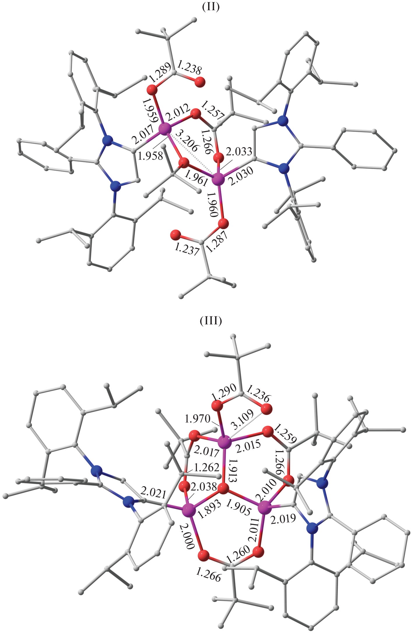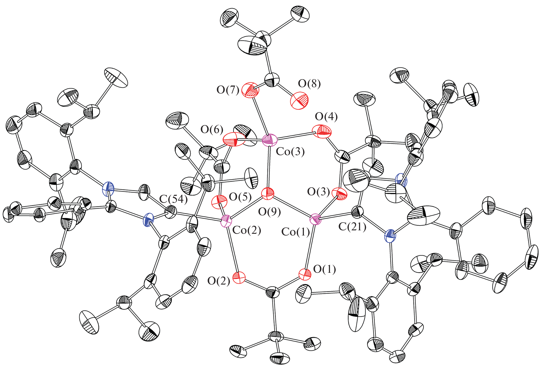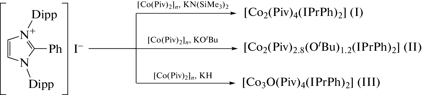 The reaction of cobalt pivalate [Co(Piv)2]n and in situ generated N‑heterocyclic carbene IPrPh (1,3-bis(2,6-diisopropylphenyl)-2-phenylimidazol-4-ylidene) affords heteroligand complexes [Co2(Piv)4-(IPrPh)2] (I), [Co2(Piv)2.8(OtBu)1.2(IPrPh)2] (II), and [Co3(μ3-O)(Piv)4(IPrPh)2] (III). The structures of complexes II·C6H14 and III are determined by X-ray diffraction (XRD) (CIF files CCDC nos. 2216724 and 2216725, respectively). Exchange spin-spin interactions between the magnetic Со2+ ions in the synthesized compounds are estimated by quantum chemical calculations.