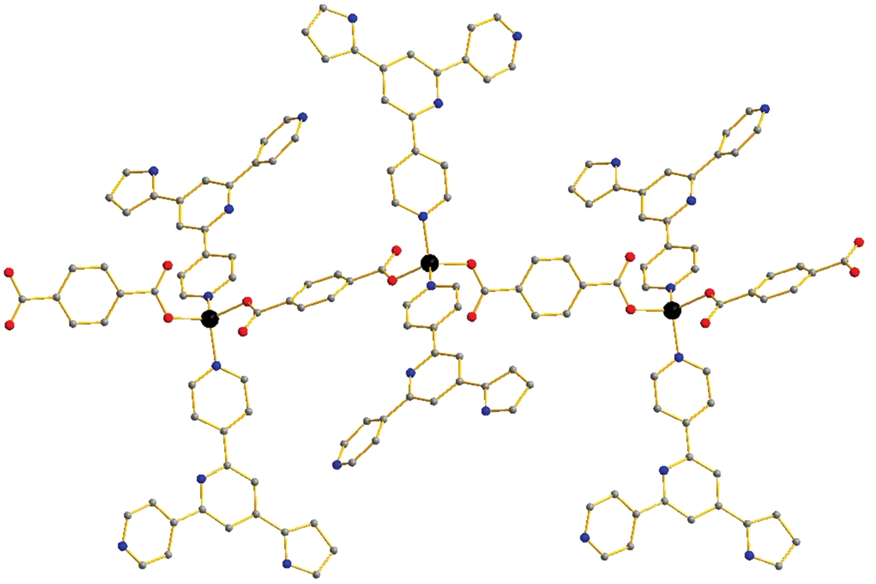 Metal-organic frameworks based on Zn(II) and 4-substiuted 4,2':6',4"-terpyridine, terephthalate (Bdc), and 2-iodoterephthalate (2-I-Bdc) derivatives, {[Zn3(FurTerPy)2(Bdc)6]} (I), {[Zn(FurTerPy)(2-I-Bdc)}] (II), and {[Zn(PyrrTerPy)2(Bdc)} (III), were prepared and characterized by X-ray diffraction.