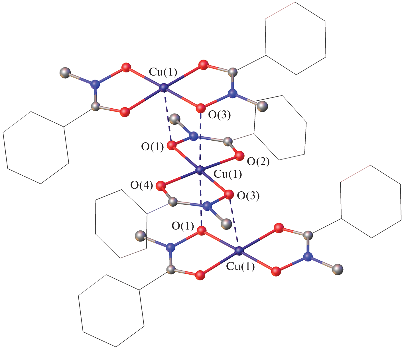 The geometrical structure of CuL2 (I), where L = R1N(O)–(O)CR2, R1 = Me, R2 = Ph, was studied by X-ray diffraction in the crystalline state and by stationary ESR spectroscopy in solution. In the crystalline state, I is a chain polynuclear complex. According to ESR data, in frozen solutions, complex I exists as three species, two being mononuclear and one being binuclear. The magnetic resonance parameters and concentrations of the species in frozen solutions were determined. The electronic structure of the complex with full geometry optimization of all systems was calculated in terms of the unrestricted density functional theory (DFT) method.