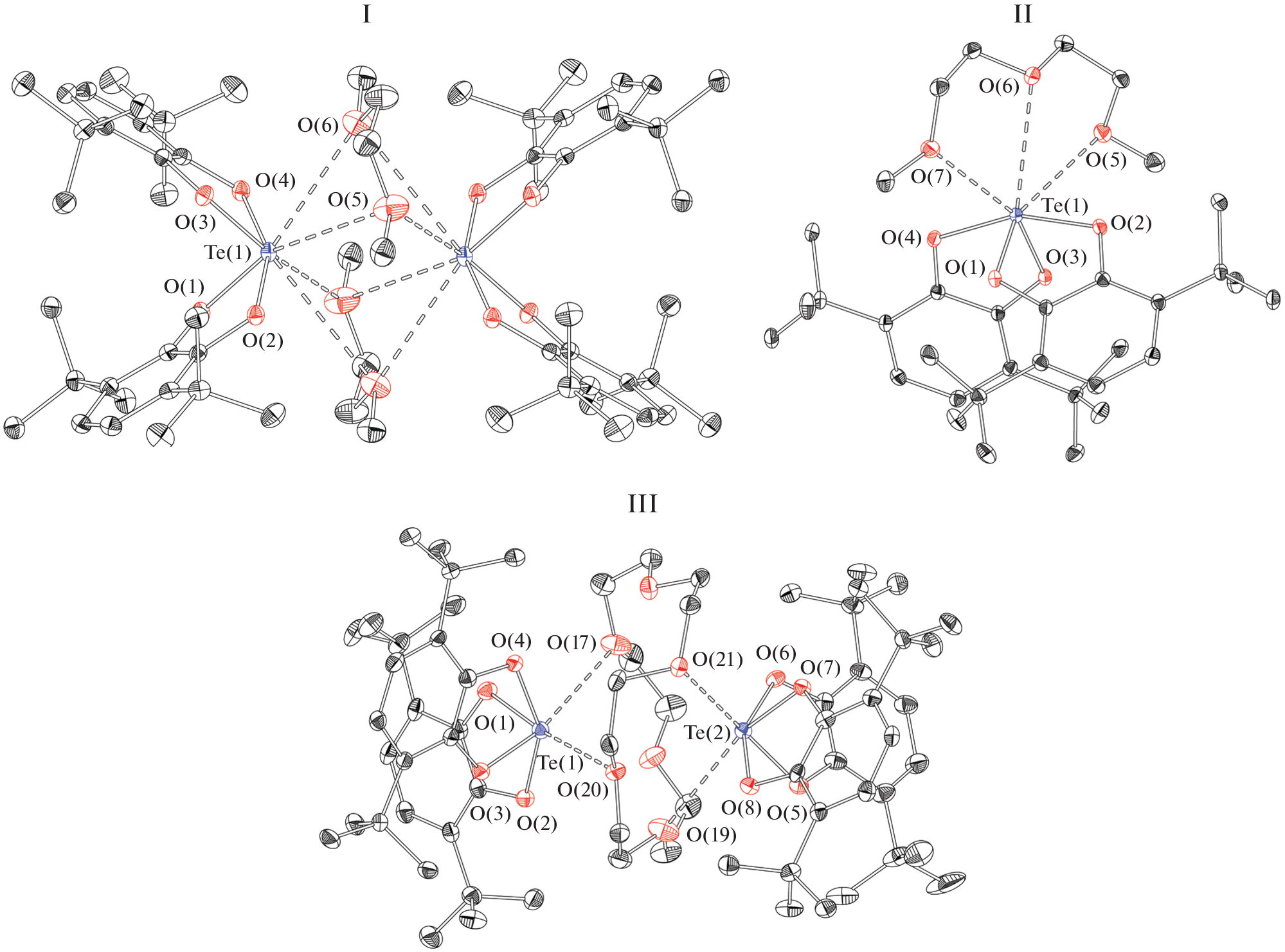 Adducts of tellurium(IV) 3,6-di-tert-butyl catecholate (Te(Cat36)2) with 1,2-dimethoxyethane (Dme), bis(2-methoxy)ethyl ether (diglyme), and crown ether 18-crown-6 (18c6) ([Te(Cat36)2(Dme)]2 (I), [Te(Cat36)2(diglyme)] (II), and [Te2(Cat36)4(18c6)] (III), respectively) are synthesized and characterized by X-ray diffraction (XRD) (CIF files CCDC nos. 2208717 (I), 2208718 (II), and 2208719 (III)). The complexes are also characterized by NMR (1H, 125Te) and IR spectroscopy.