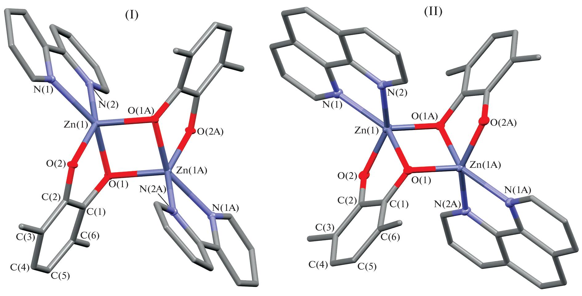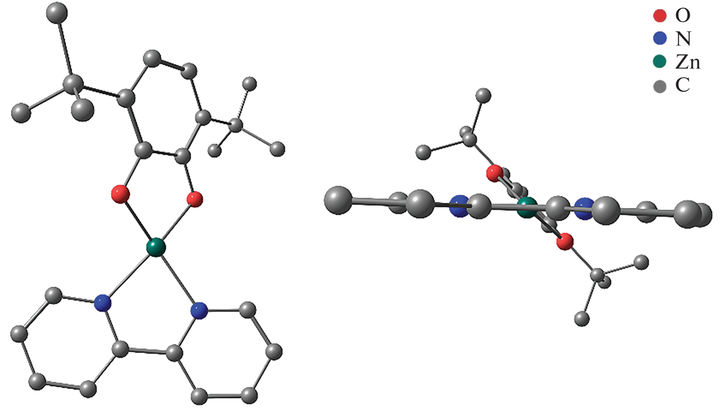 New heteroleptic zinc catecholate complexes based on 3,6-di-tert-butyl-o-benzoquinone and containing metal-coordinated N-donor ligands (2,2'-bipyridine and phenanthroline) were prepared by ligand exchange. According to X-ray diffraction data, both complexes were dimers with multiple intermolecular π–π interactions between the aromatic moieties of neighboring molecules (CCDC nos. 2222704 (I), 2222705 (II)). The electronic transmission spectra of crystalline samples of I and II and their solutions show broad absorption bands in the visible region with a maximum at about 500 nm.