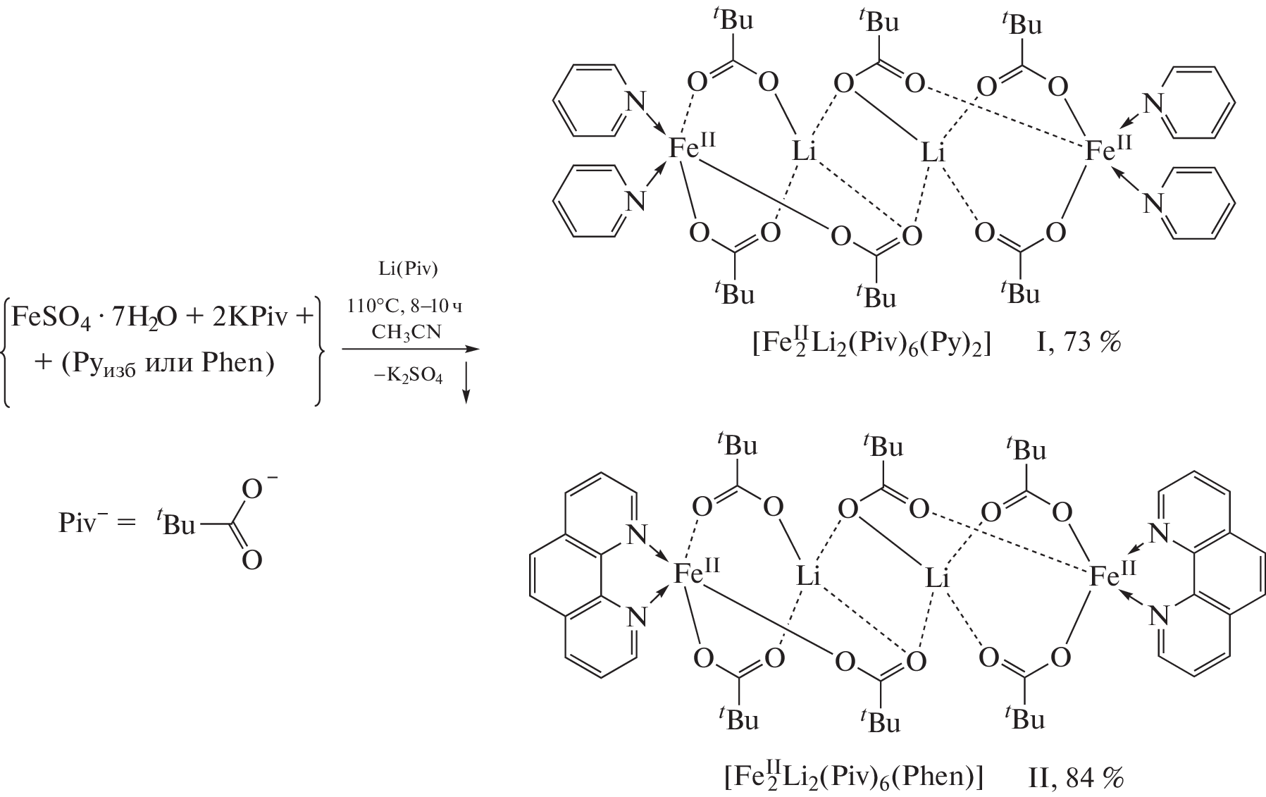 The multicomponent chemical reactions of Fe(SO4)∙7H2O, Li(Рiv), K(Рiv) (Рiv is pivalate anion), and heterocyclic N-donor ligands (pyridine (Рy), 1,10-phenanthroline (Рhen)) in anhydrous acetonitrile under an inert atmosphere afford new heterometallic tetranuclear complexes [FeII2