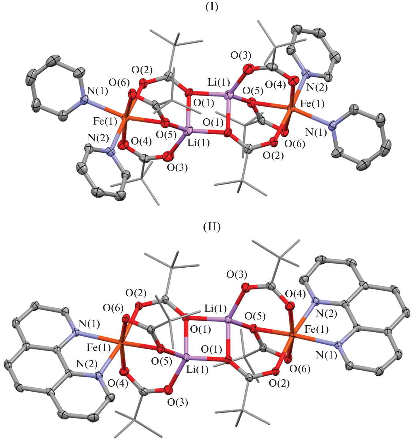 Li2(Рiv)6(Рhen)2] (II) in which all carboxylate anions act as bridging ligands. The molecular and crystal structures of the compounds are determined by X-ray diffraction (XRD) (CIF files CCDC nos. 2220576 (I) and 2220577 (II·2CH3CN). In the studied complexes, the iron(II) atoms exist in the distorted octahedral ligand environment.