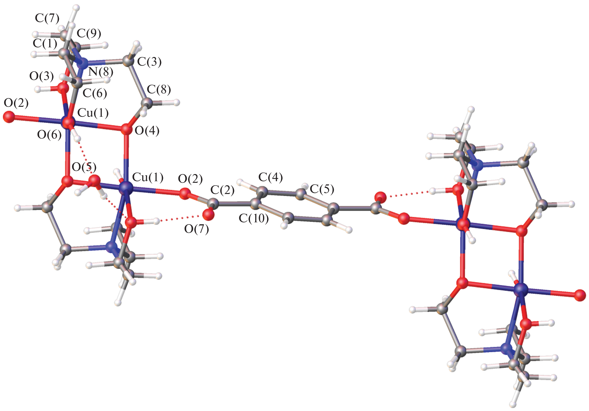 The reactions of Cu(II), Co(II), and Zn(II) terephthalates with hydroxyalkylamines (tris(2-hydroxyethyl)amine, bis(2-hydroxyethyl)amine, tris(hydroxymethyl)aminomethane, and bis(2-hydroxyethyl)aminotris(hydroxymethyl)methane) are studied for the first time. The structures and properties of the synthesized complexes are studied by IR spectroscopy, electronic absorption spectroscopy, mass spectrometry, and elemental and thermal analyses. The structure of the binuclear heteroligand [Cu2(TEA)2(Tph)]n·H2O complex is studied by single-crystal X-ray diffraction (XRD) (CIF file CCDC no. 2224437).