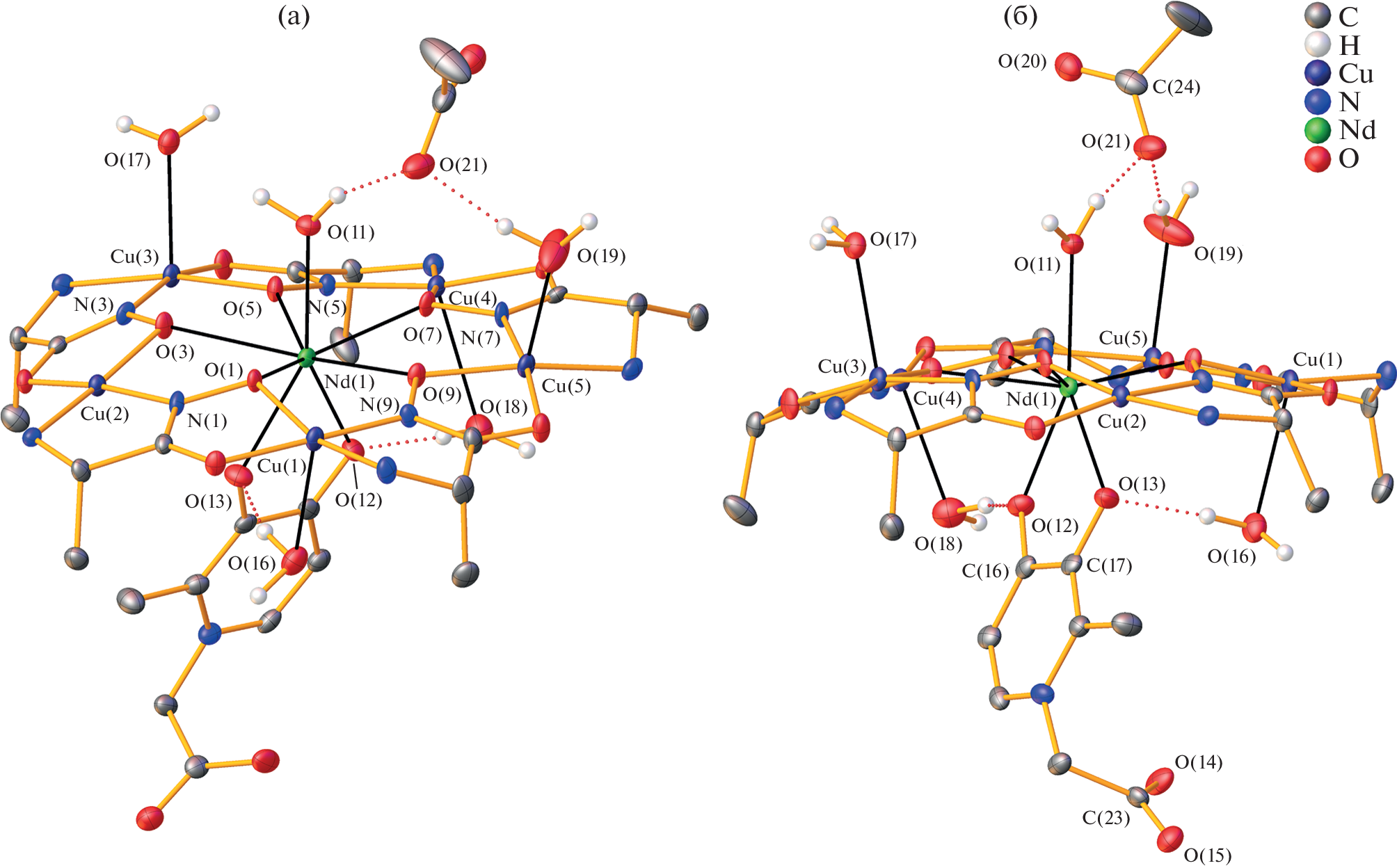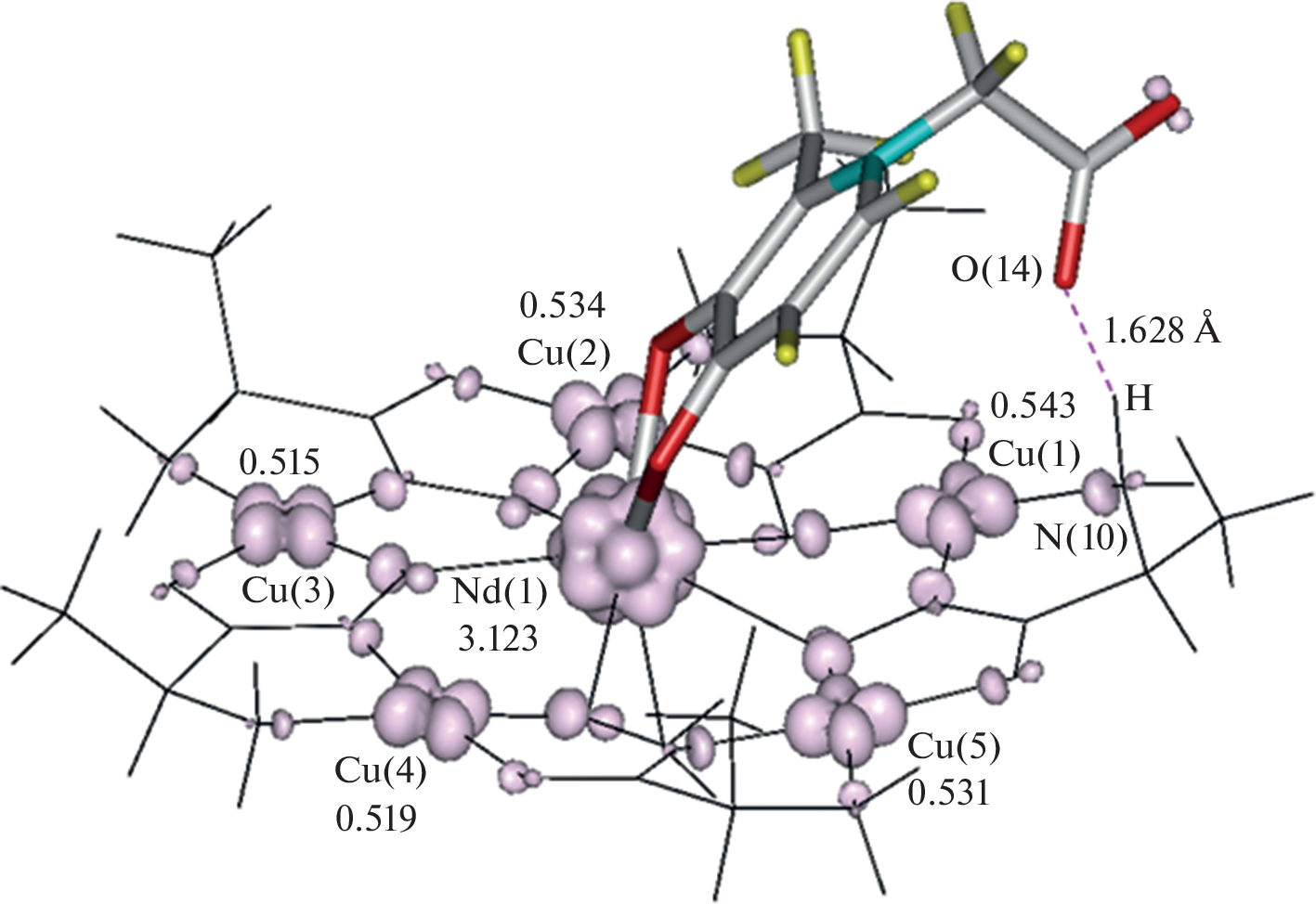 На основе (3-гидрокси-2-метил-4-оксо-4H-пиридин-1-ил)-ацетата (L) впервые синтезирован полиядерный аланингидроксиматный металламакроциклический комплекс Nd(C8H7NO4)(H2O)[15-MCCu(II)Alaha-5](CH3COO) с аксиальным 3-гидрокси-4-пиридиноновым лигандом. Методами РСА (CCDC 2242224) и квантовой химии установлено, что при взаимодействии лиганда L с ионом Nd3+, удерживаемым за счет ионных связей с атомами кислорода в матрице медьсодержащего металламакроцикла, происходит формирование аксиальных связей между Nd3+ и диоксоленовым фрагментом пиридинонового лиганда, имеющих ковалентный вклад. Эти аксиальные связи приближаются по своим топологическим и энергетическим характеристикам к связям Cu2+ с аминовыми атомами азота аланингидроксиматного металламакроцикла.