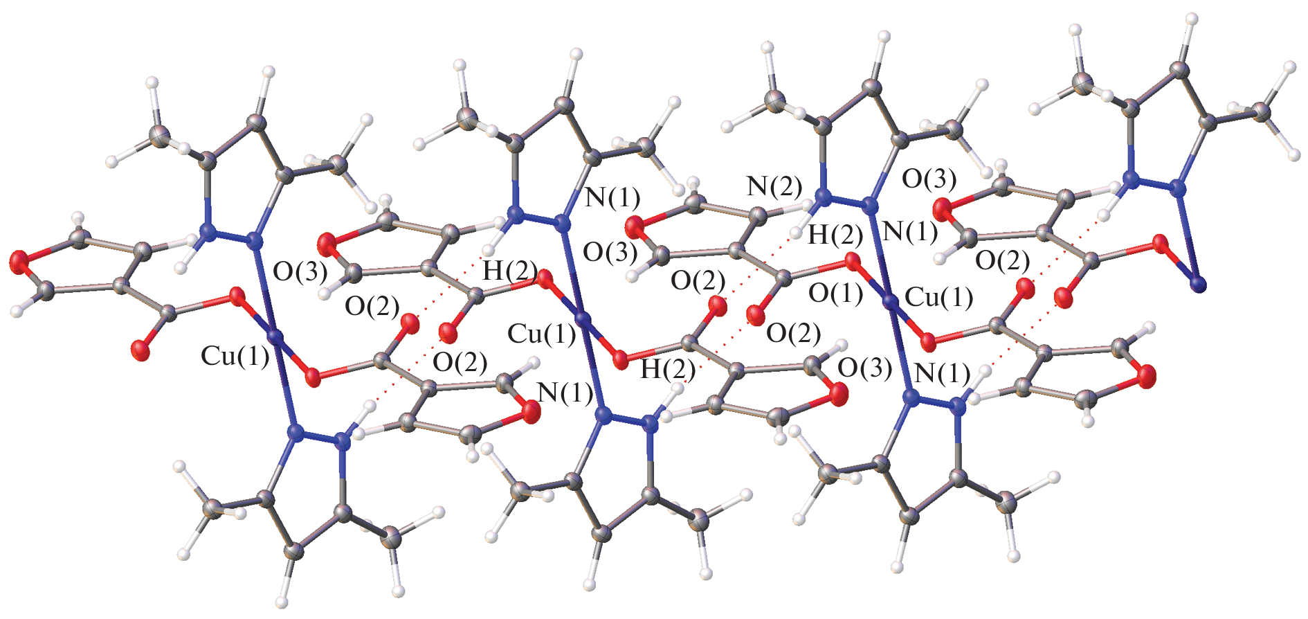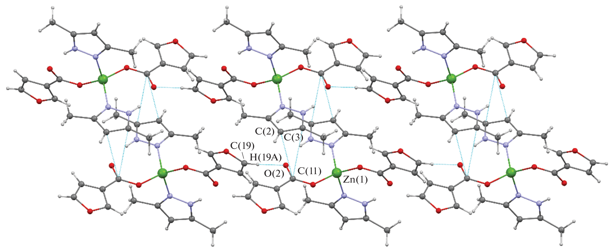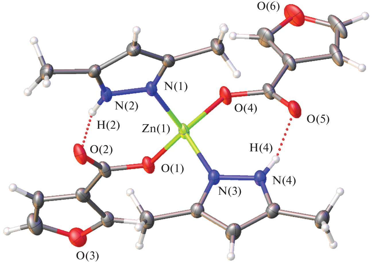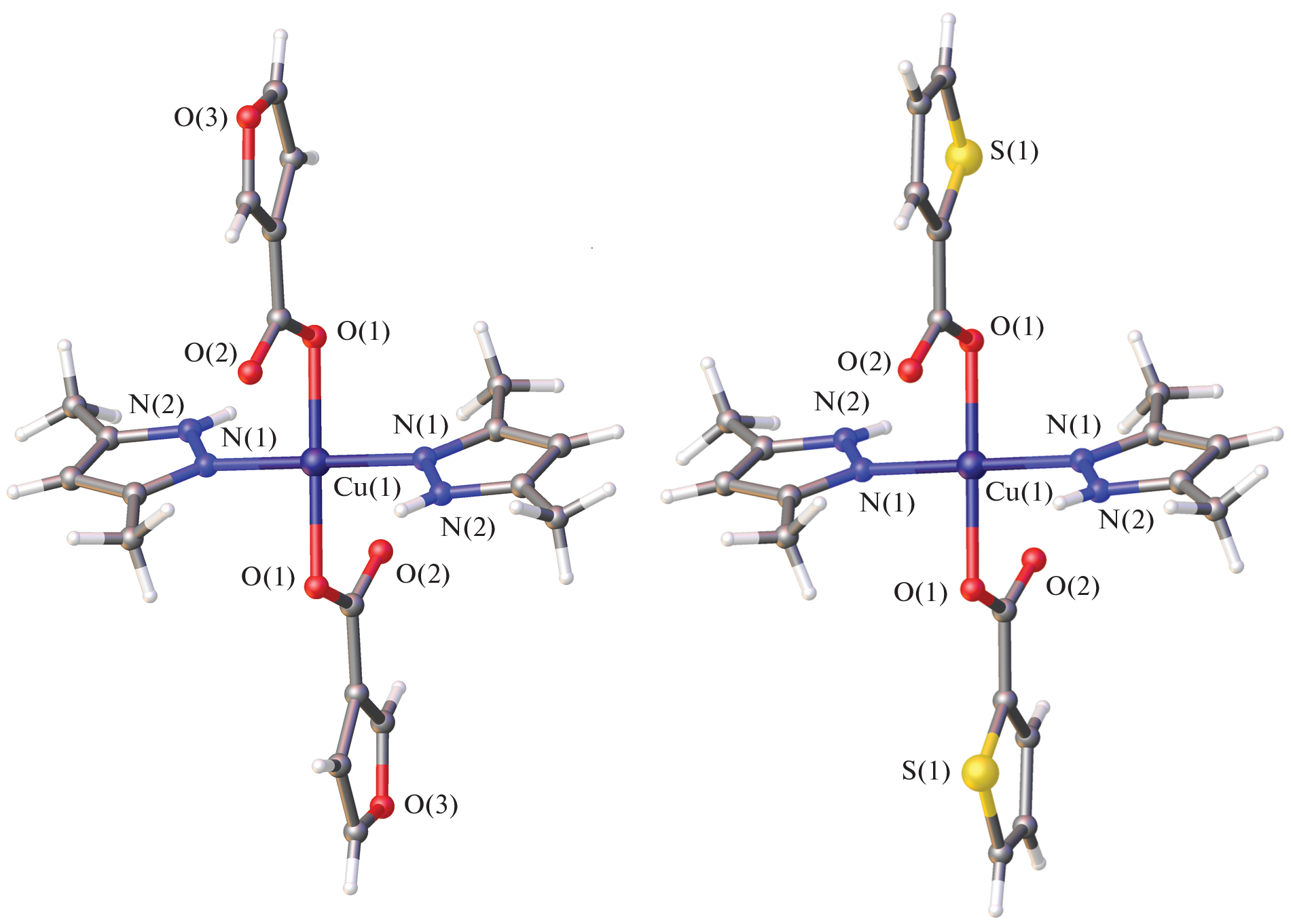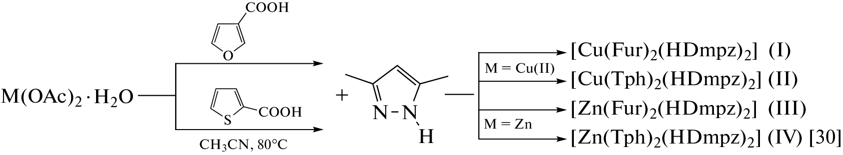 The reaction of copper(II) and zinc(II) acetates with 3-furancarboxylic (HFur) and 2-thiophenecarboxylic (HTph) acids with subsequent addition of 3,5-dimethylpyrazole (HDmpz) gave mononuclear complexes [M(L)2(HDmpz)2] (M = Cu(II), L = Fur– (I), Tph– (II); Zn(II), L = Fur– (III)). The structures of compounds I–III were determined by X-ray diffraction. According to X-ray diffraction data, I and II are isostructural: the central Cu(II) atom occurs in a square planar environment formed by two oxygen atoms of carboxylate anions and HDmpz nitrogen atoms; in III, the Zn atom is in the tetrahedral environment of two furoate anions and HDmpz molecules, thus forming the {MO2N2} groups. The complexes are additionally stabilized in the crystal by inter- (I and II) and intramolecular (III) hydrogen bonds. The biological activity of I–III was determined in relation to the non-pathogenic Mycolicibacterium smegmatis.