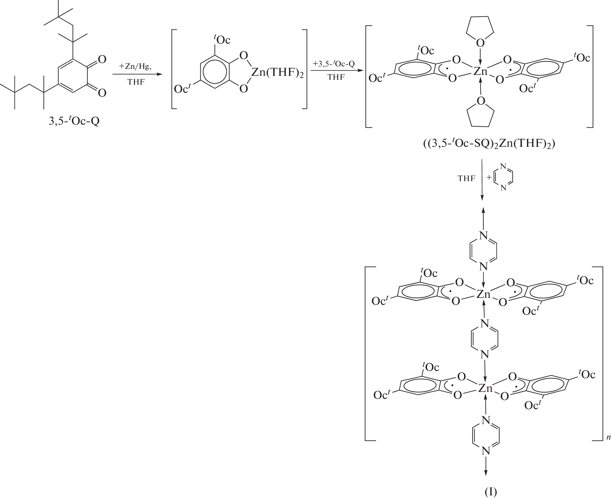 New zinc bis-o-semiquinolate complexes based on 3,5-di-tert-octyl-o-benzoquinone bearing the N-donor ligand (pyrazine) coordinated to the metal are synthesized. Two different products can be obtained depending on the synthesis method: coordination polymer (direct oxidation of metallic zinc with o-quinone (CIF file CCDC no. 2250574 (I)) or polynuclear cluster (exchange reaction (CIF file CCDC no. 2250575 (II)). The coordination polymer is linear and free of intermolecular π,π interactions between the aromatic fragments of the adjacent molecules. The magnetochemical study of complexes I and II shows that intramolecular antiferromagnetic exchange interactions between spins of the o-semiquinolate radical centers dominate.