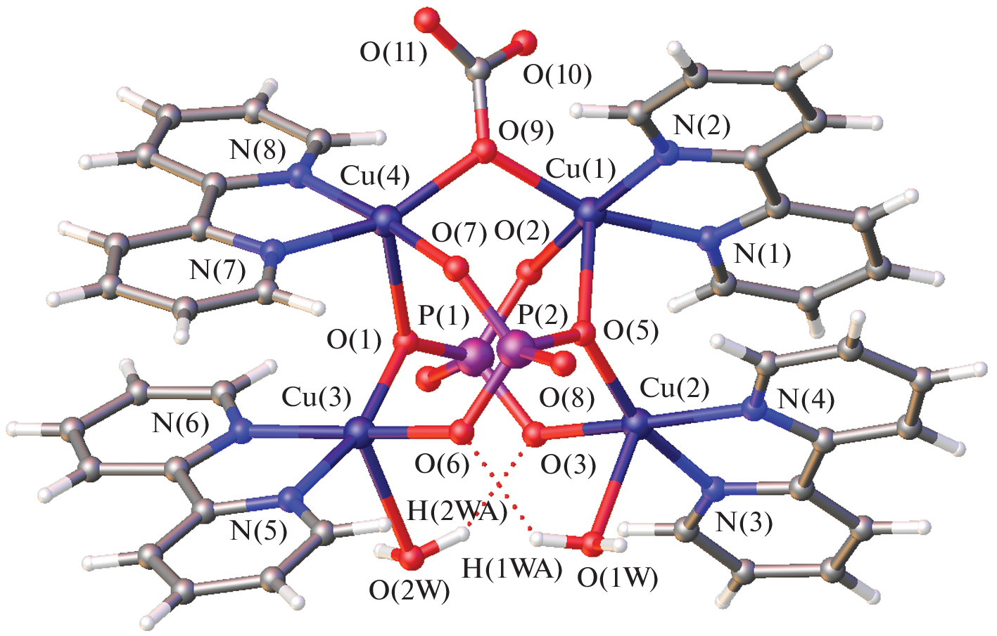 The interaction in the system {Сu(OAc)2·H2O–phytic acid–2,2`-bipyridine (bpy)} in an aqueous-methanol solution led to the formation of a molecular mixed-ligand tetranuclear complex [(Cu4(bpy)4(PO4)2(CO3 )(H2O)2]13H2O (I), the structure of which was established based on the results of an X-ray diffraction experiment (CCDC 2262998). According to X-ray diffraction data, the molecule contains four nonequivalent Cu2+ cations, which coordinate two phosphate anions (PO43-, remaining as a result transformation of the phytate cycle), four neutral bpy, two water molecules and one carbonate anion fragment (CO32-). The presence of a large number of solvate water molecules in the outer coordination sphere created a hydrogen-bonded framework involved in the stabilization of the crystal packing. Study of antimycobacterial activity of I in against the non-pathogenic strain Mycolicibacterium smegmatis showed its high bioeffectiveness.