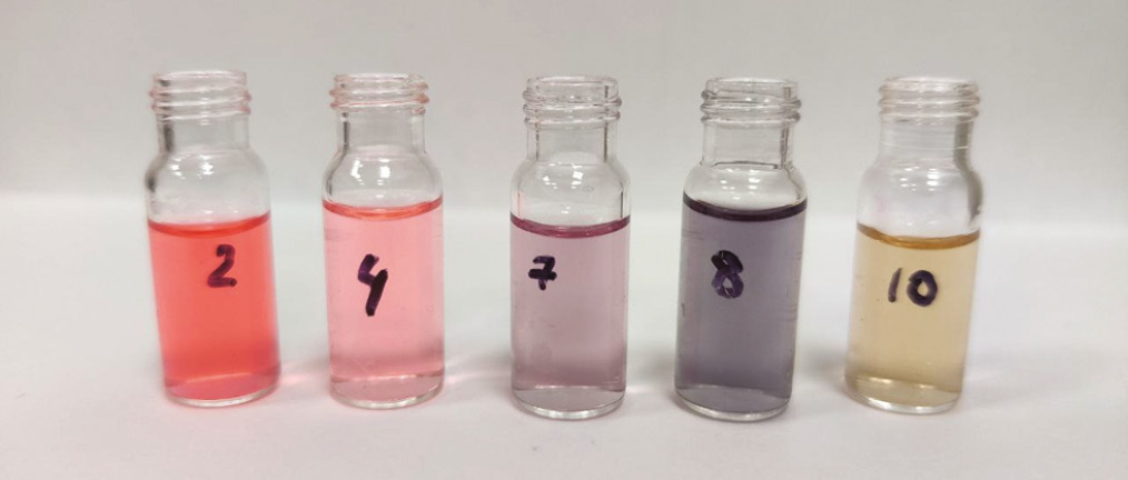 Рис. 3. Изменение окраски экстракта чашечек суданской розы в зависимости от кислотности среды, указанной на виалах.
