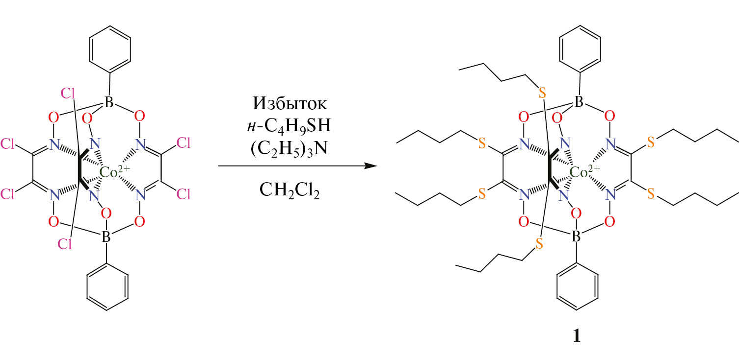 Использовали фенилборатный гекса-н-бутилсульфидный клатрохелат кобальта(II) (I) (cхема 1), синтезированный по известной методике [27]. Его гексахлороклатрохелатный предшественник получали темплатной конденсацией на матрице – ионе кобальта(II), как описано в [19]. Состав и строение полученного комплекса подтверждены данными элементного анализа, а также спектроскопии ЯМР 1Н. Элементный анализ на углерод, азот и водород проводили на микроанализаторе Carlo Erba, модель 1106.