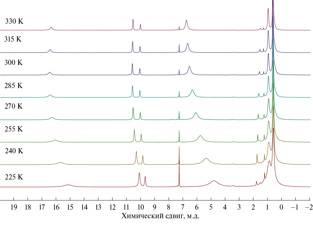 Рис. 1. Спектры ЯМР 1Н раствора комплекса I в CDCl3, зарегистрированные в температурном диапазоне 225–330 K.