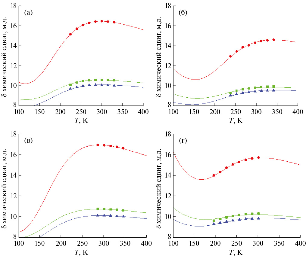 Рис. 2. Температурная зависимость химических сдвигов в спектрах ЯМР 1Н комплекса I в различных растворителях: CDCl3 (а), CD3CN (б), C6D6 (в) и CD2Cl2 (г). Показаны данные для следующих протонов его макробициклической молекулы: орто-Ph (●), мета-Ph (■) и пара-Ph (▲). Сплошные линии соответствуют аппроксимации с использованием уравнения (9).