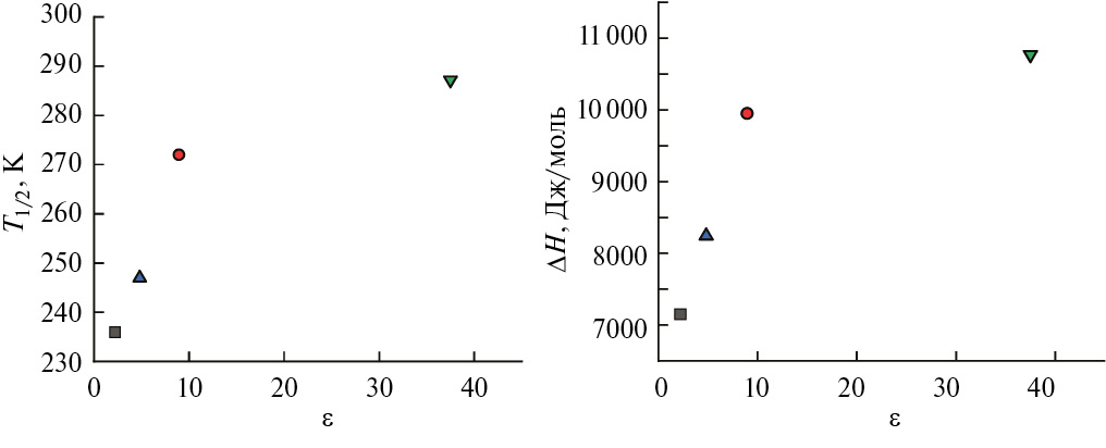 Наблюдается корреляция между полярностью растворителя и термодинамическими параметрами вышеупомянутого спинового перехода: при увеличении диэлектрической проницаемости растворителя увеличиваются его энтальпия ΔH и температура полуперехода T1/2, что может быть связано с увеличением зарядов на донорных атомах азота макробициклического лиганда в результате его взаимодействии с молекулами полярного растворителя (рис. 4).