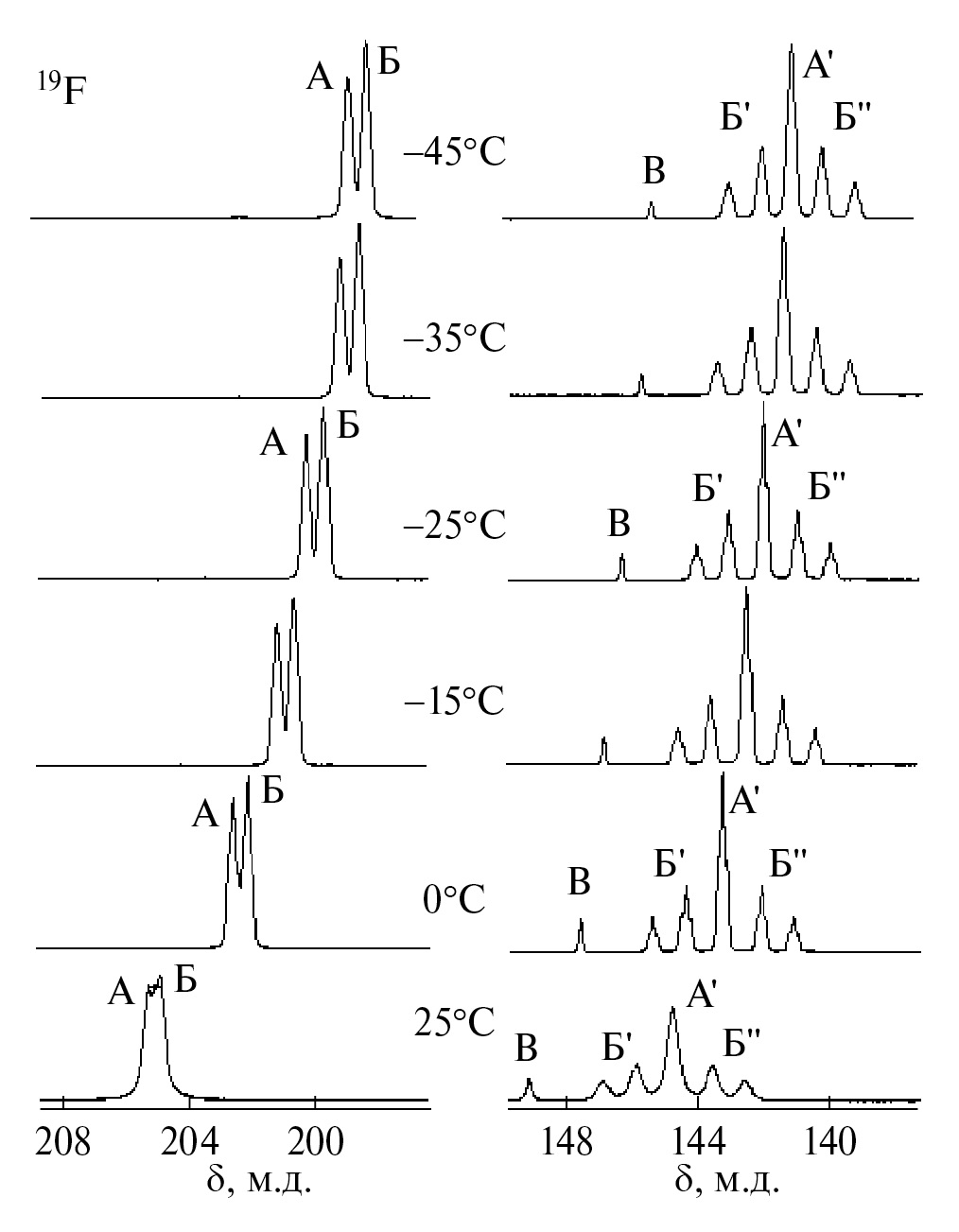 Два триплета А, A' равной интенсивности отнесены к диастереомеру цис-TiF4L2, имеющему две неэквивалентных позиции атомов фтора, в котором атомы фтора на ординате F1—Ti–F1 эквивалентны. Три группы линий – дублет дублетов Б и дублеты триплетов Б' и Б''с соотношением интенсивностей 2 : 1 : 1 (спектр ЯМР второго порядка А2ХУ) связаны с присутствием в растворе диастереомера цис-TiF4L2, в котором атомы фтора в транс-положении друг к другу F1—Ti–F1' неэквивалентны. Сохраняющаяся при изменении хим. сдвигов дублетов триплетов Б' и Б''(с уменьшением температуры образца) величина разности резонансных частот между триплетами в дублетах Б' и Б'' равная 286.1 Гц, позволяет отнести ее к константе спин-спинового взаимодействия между неэквивалентными атомами фтора F1 и F1', расположенными в транс-положении друг к другу (КССВ JF1F1').