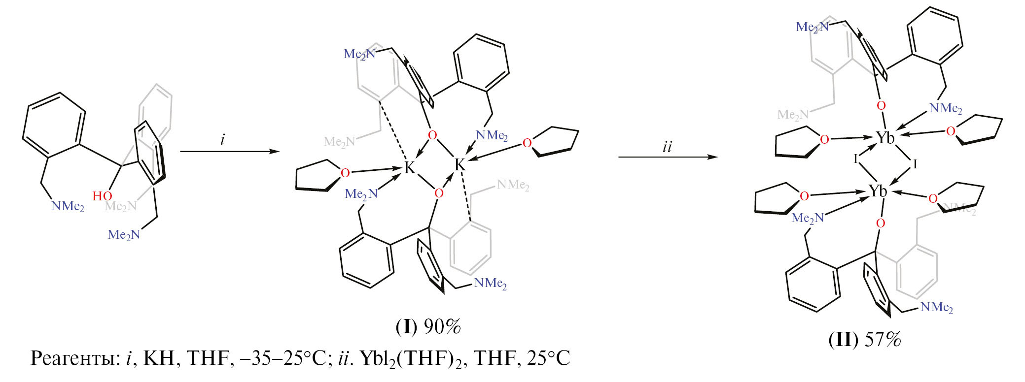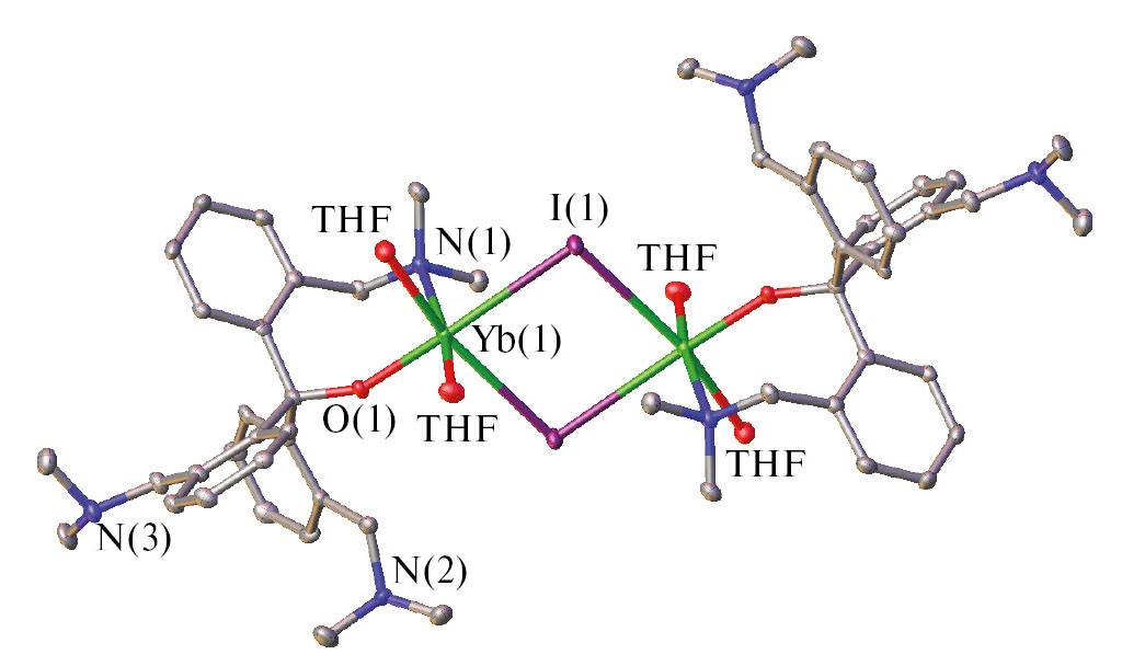 По реакции эквимолярных количеств YbI2(THF)2 и I в ТГФ при 25˚С (см. схему 1) был синтезирован алкокси-иодидный комплекс {[(2-Me2NCH2C6H4)3CO]Yb(µ-I)(THF)2}2 (II), который был выделен в виде оранжевых кристаллов при перекристаллизации из смеси ТГФ—гексан с выходом 57%. Комплекс II хорошо растворяется в ТГФ и нерастворим в гексане. При растворении II в ароматических растворителях происходит выпадение мелкокристаллического желто-оранжевого осадка, непригодного для проведения РСА. Однако данные микроанализа и ИК-спектроскопии свидетельствуют о потере одной молекулы координированного ТГФ и образовании комплекса предполагаемого состава {[(2-Me2NCH2C6H4)3CO]Yb(µ-I)(THF)}2. При этом перераспределения лигандов и образования симметричных продуктов не наблюдалось.