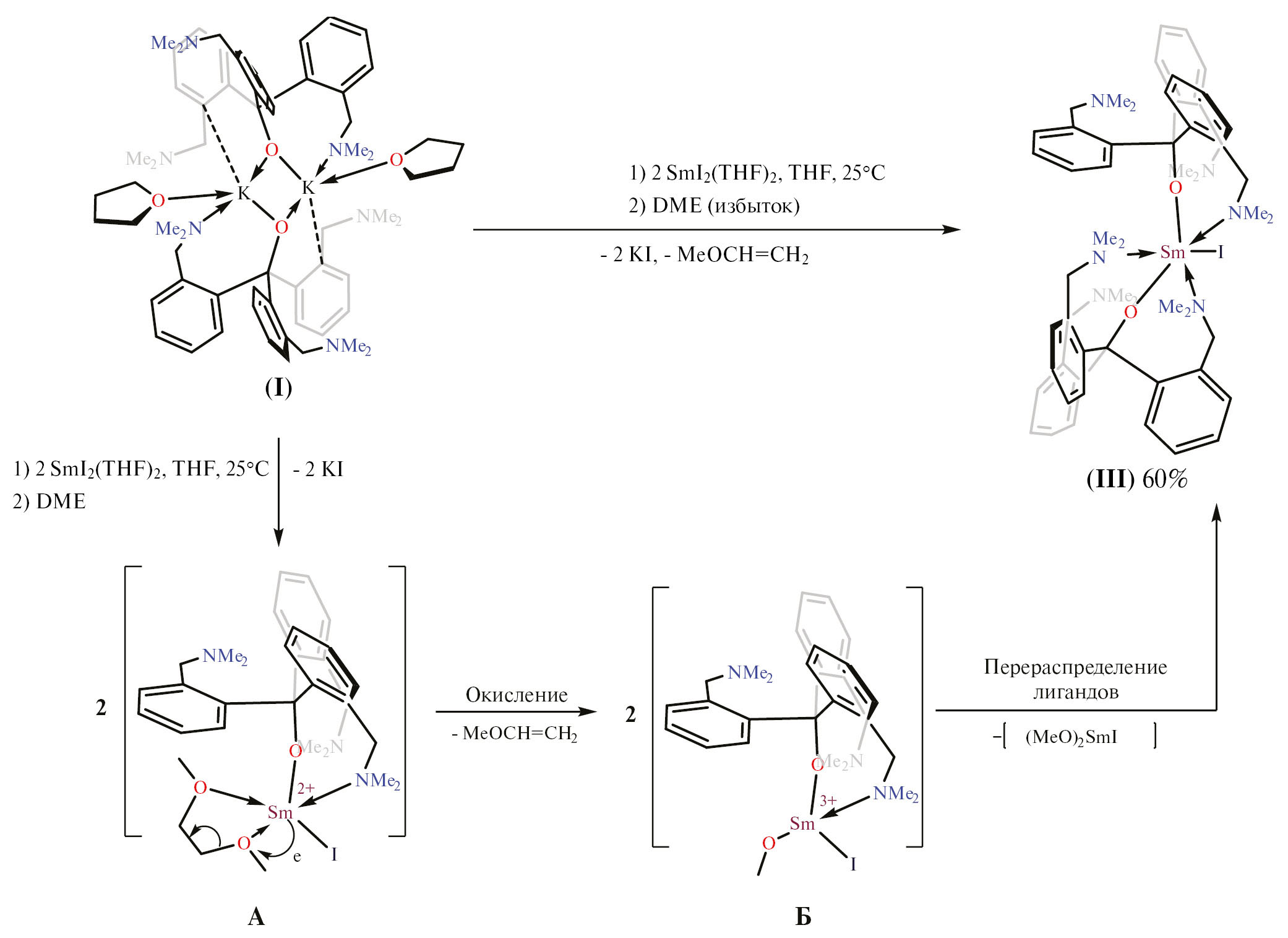 В случае реакции I с SmI2(THF)2 (ТГФ—ДМЭ, 25˚С) был получен бис(алкоксид)-иодидный комплекс трехвалентного самария [(2-Me2NCH2C6H4)3CO]2SmI (III). Соединение выделено в виде желтых кристаллов с выходом 60% в расчете на исходный алкоксид калия I (схема 2).