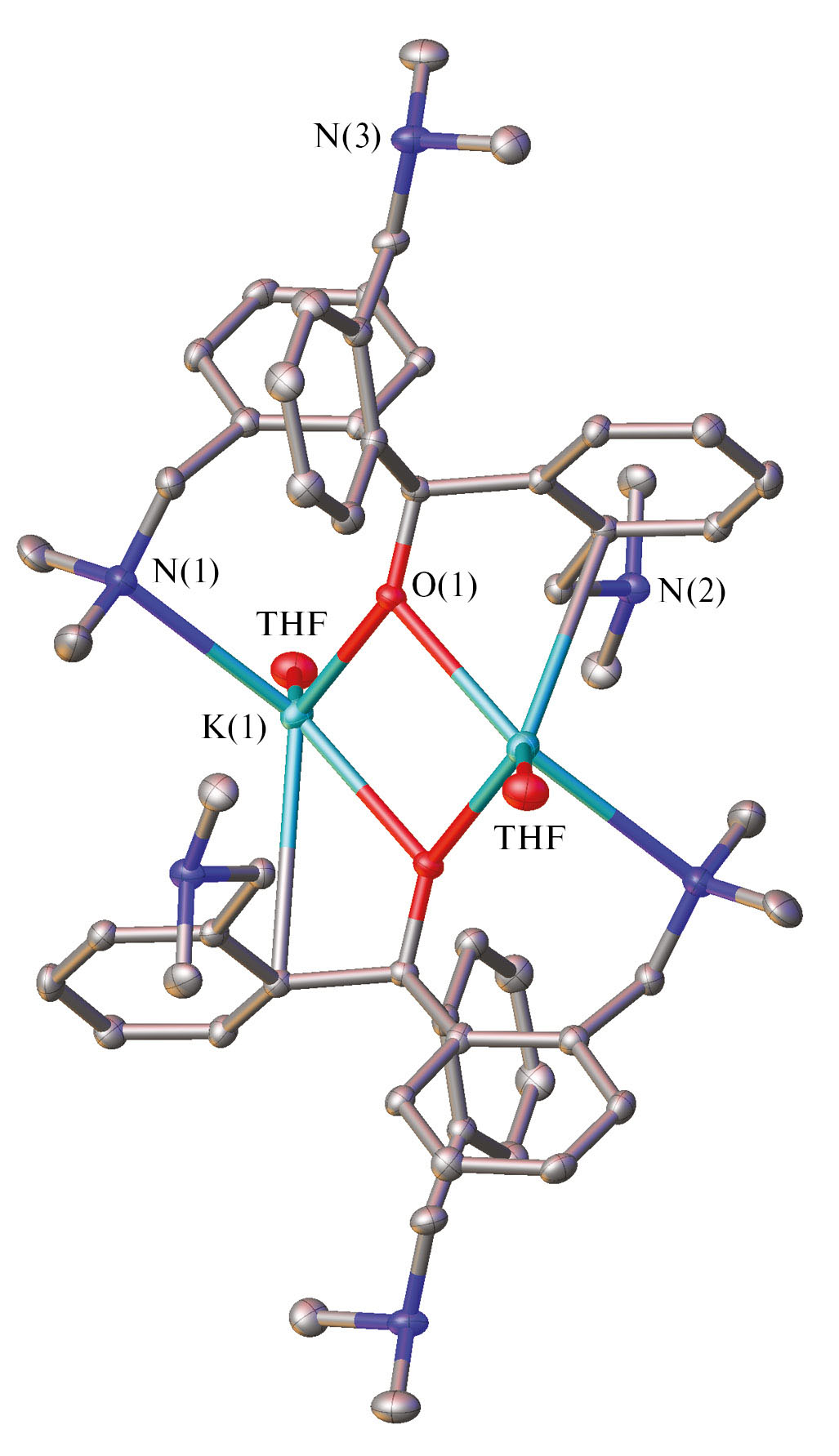 Комплекс I не чувствителен к кислороду, однако во влажной атмосфере быстро происходит гидролиз с образованием исходного карбинола и гидроксида калия. Комплекс хорошо растворим в ТГФ, имеет ограниченную растворимость в ароматических углеводородах (бензол, толуол) и нерастворим в гексане. Молекулярная структура комплекса I представлена на рис. 1, основные длины связей и валентные углы приведены в табл. 2. Согласно данным РСА комплекс I кристаллизуется в триклинной пространственной группе симметрии P¯I. Молекула соединения I представляет собой димер, в котором ионы калия связаны между собой мостиковыми алкоксидными анионами (см. рис. 1). Каждый катион калия в комплексе I координирован алкоксидным лигандом по типу μ2-O, k1-N, в то время как оставшиеся NMe2-группы не координированы с металлом. Центральный фрагмент K(μ2-O)2K абсолютно плоский с углами K(1)O(1)K(1) 95.55(7)˚ и O(1)K(1)O(1) 84.46(9)˚. Длины связей K—O (2.621(3) и 2.531(3) Å) сопоставимы со значениями, характерными для известных алкоксидов калия (КЧ 4) [39]. В отличие от ранее опубликованных алкоксидных комплексов калия [tBuOK]4 [40], [tAmylOK]4 [41], [Ph2CMeOK]4 [39] и [Thienyl3COK]4 [42], имеющих тетрамерную гетерокубановую структуру, димерная структура комплекса I реализуется вследствие полидентатной природы и исключительного объема аниона (2-Me2NCH2C6H4)3CO–. Координационная сфера К+ содержит также молекулу ТГФ. Отметим наличие невалентного взаимодействия катиона K+ с одним из трех ароматических фрагментов трис(арил)карбинолятного лиганда, которое выражается в виде короткого контакта атома калия с ипсо-атомом углерода (K—Cipso 3.390(4) Å) (см. рис. 1). Этот факт несколько необычен, поскольку при этом донорная аминогруппа NMe2, связанная с этим же ароматическим фрагментом, не координируется с металлом.