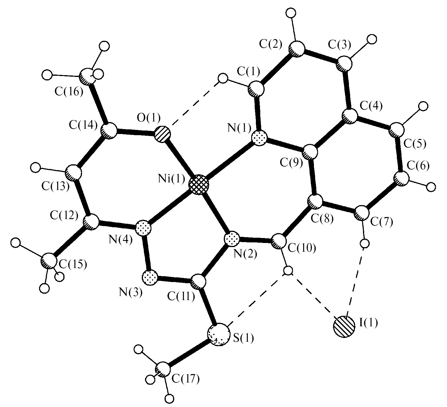 Cоединение I кристализуется в триклинной пространственной группе P¯1 (см. табл. 1) и состоит из комплексного катиона [NiL]+ с квадратно-плоскостным окружением центрального атома и внешнесферного иодид-аниона. В катионе монодепротонированный тетрадентатный открытый лиганд координирован к центральному атому через набор донорных атомов N3O, образуя три сочлененных металлоцикла, два из которых шестичленные и один пятичленный (рис. 1). Расстояния Ni—N находятся в пределах 1.781(9)—1.928(9) Å, Ni—O 1.770(9) Å (см. табл. 2). Комплексный катион дополнительно стабилизирован слабыми внутримолекулярными ВС С(1)—H(1)∙∙∙O(1) и С(10)—H(10)∙∙∙S(1) (см. табл. 3).