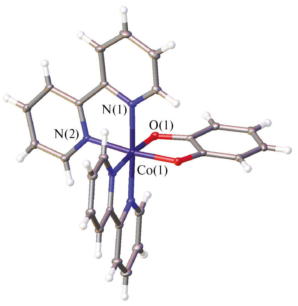 Общая процедура синтеза комплексов [Co(Bipy)2(coumarin-diolate)]ClO4 (I) и [Co(Bipy)2(catecholate)]ClO4 (II). К раствору [Co(Bipy)2Cl2]Cl (0.5 ммоль, 221.1 мг) в 15 мл метанола добавляли раствор триэтиламина (1 ммоль, 101.2 мг, 139 мкл) и соответствующего дигидроксисоединения (6,7-дигидроксикумарина (0.5 ммоль, 89 мг) или пирокатехина (0.5 ммоль, 55 мг)) в 10 мл метанола. Полученную смесь кипятили в течение 3 ч, затем охлаждали до комнатной температуры, добавляли раствор перхлората лития (1.25 ммоль, 133 мг) в 5 мл метанола и перемешивали 30 мин при охлаждении на водяной бане для кристаллизации целевых комплексов. Образовавшийся зеленый осадок отделяли фильтрованием, промывали изопропанолом и диэтиловым эфиром и высушивали при пониженном давлении.