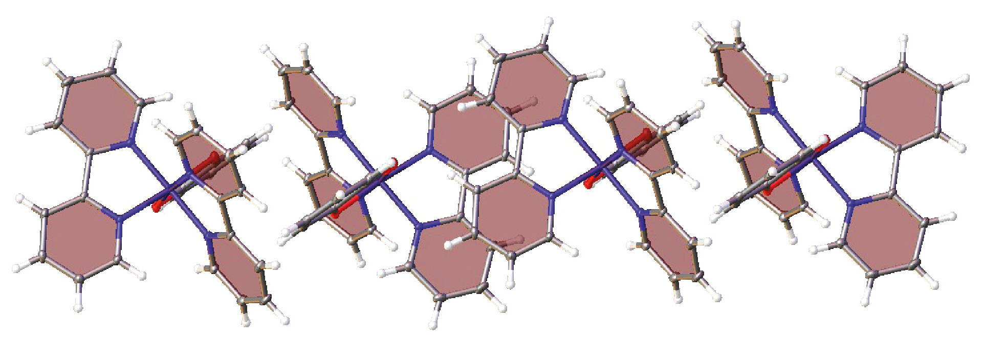 Рис. 2. Фрагмент кристаллической упаковки комплекса II, иллюстрирующий образование 1D-цепей за счет стекинг-взаимодействия между бипиридиновыми лигандами (выделены розовым цветом).