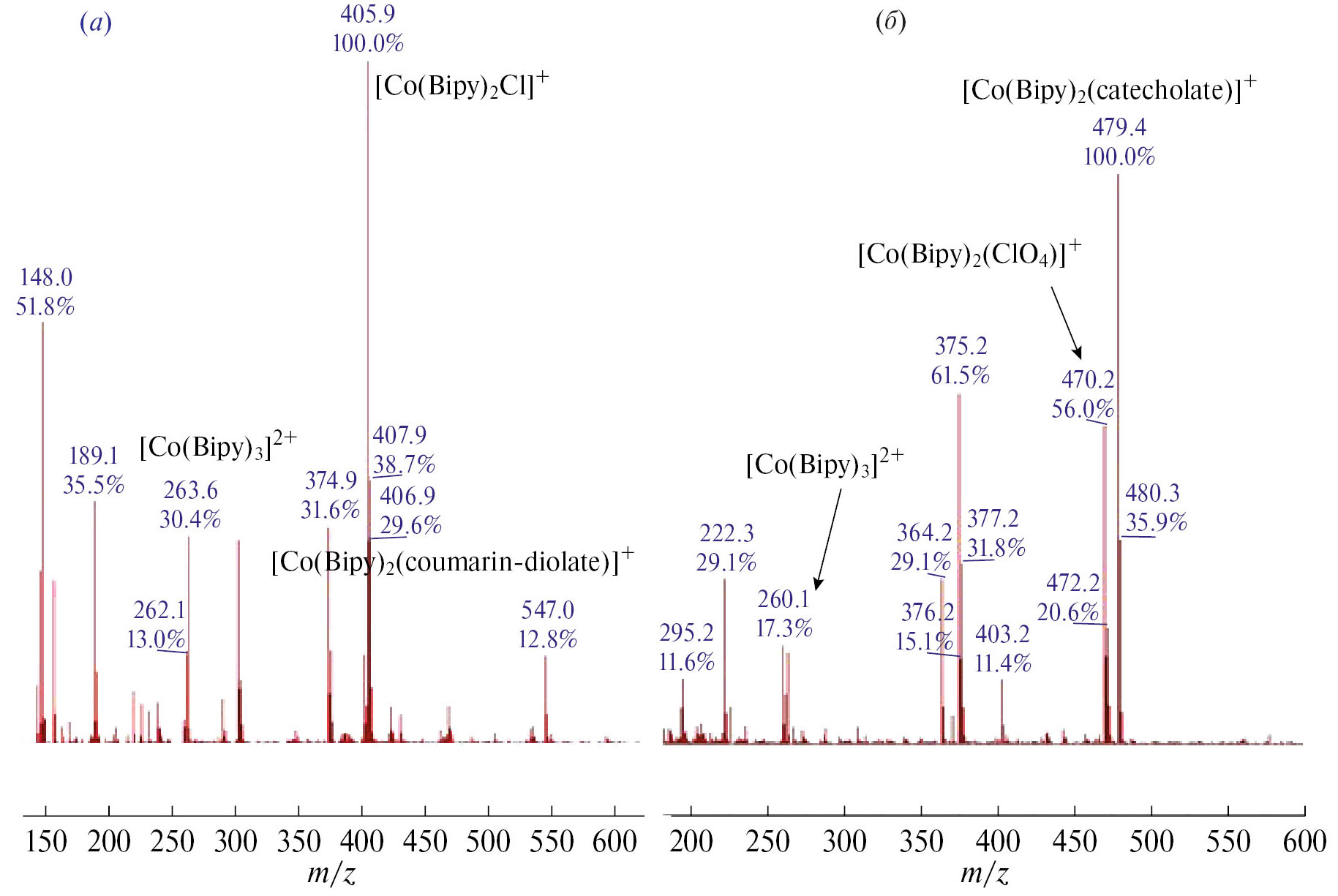 На рис. 3 приведены спектры ЯМР 1Н, иллюстрирующие динамику процесса восстановления комплекса II аскорбиновой кислотой в атмосфере аргона. Данный процесс приводил к образованию комплексов, содержащих парамагнитный ион Co2+, в связи с чем в спектрах ЯМР 1Н можно было выделить диамагнитную (от 0 до 10 м.д.) и парамагнитную (от 15 до 120 м.д.) области. Первая содержала сигналы исходного комплекса, аскорбиновой кислоты, продукта ее окисления и свободного пирокатехина, а вторая – сигналы образующихся комплексов кобальта(II). Видно, что по мере протекания реакции интенсивность сигналов в диамагнитной области уменьшается, а в парамагнитной, наоборот, увеличивается. При этом количество наблюдаемых сигналов в парамагнитной области спектра оставалось постоянным в процессе восстановления, а менялась только их относительная интенсивность. Oтметим, что парамагнитные области спектров ЯМР, зарегистрированных спустя 40 мин после инициирования реакции восстановления комплексов кобальта(III) I и II, содержали восемь сигналов, значения химических сдвигов для которых совпадали (рис. 4). В спектре продуктов восстановления комплекса II обнаружено три дополнительных сигнала с низкой интенсивностью. Однако такие же сигналы появлялись и в спектрах смеси I с аскорбиновой кислотой спустя несколько часов после начала реакции. Совпадение значений химических сдвигов для сигналов в парамагнитной области указывало на то, что комплексы кобальта(II) состава [Co(Bipy)2(L)]2+А–2, где L – дианион 2-оксо-2Н-хромен-6,7-диолат или катехолат, а А– – противоион, не накапливаются в реакционной смеси. Из сравнения полученных спектров со спектром комплекса кобальта(III) [Co(Bipy)3](ClO4)2, зарегистрированным в ацетонитриле-d3, видно, что наиболее интенсивные сигналы совпадают с сигналами в спектре указанного комплекса (см. рис. 4, отмечены *). Из анализа полученных данных можно сделать вывод, что восстановление комплексов кобальта(III) I и II аскорбиновой кислотой сопровождается образованием комплекса кобальта(II) [Co(Bipy)3](ClO4)2 в качестве основного продукта. Масс-спектры реакционных смесей (рис. 5) наряду с сигналами, соответствующими исходным комплексным ионам [Co(Bipy)2(L)]+, содержали сигналы с m/z 263.6, 405.9 и 470.2, относящиеся к ионам [Co(Bipy)3]2+, [Co(Bipy)2Cl]+ [Co(Bipy)2(ClO4)]+. Появление в масс-спектре аддуктов с хлорид-анионом может быть связано с неполной заменой хлорид-иона на перхлорат при синтезе исследованных комплексов из [Co(Bipy)2Cl2]Cl. Данные спектроскопии ЯМР и масс-спектрометрии подтверждают механизм восстановления, представленный на схеме 2.