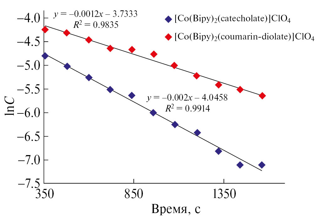 В дополнение к информации о составе реакционной смеси, полученной при восстановлении комплексов кобальта(III) I и II аскорбиновой кислотой в атмосфере аргона, анализ данных in situ спектроскопии ЯМР позволил сравнить скорость реакции для двух комплексов, определить порядок реакции и константу скорости. На рис. 6 представлено сравнение кинетических кривых расходования комплексов I и II в процессе их восстановлении аскорбиновой кислотой в атмосфере аргона. Из рис. 6 видно, что комплекс, содержащий дианион катехолат, восстанавливается в ~2 раза быстрее. Периоды полупревращения для комплексов II и I составили 9 и 19 мин соответственно. Зависимость натурального логарифма концентрации исходных комплексов от времени аппроксимировалась прямой с коэффициентом достоверности, близким к единице (рис. 7). Линейная аппроксимация свидетельствовала о первом порядке по исходному реагенту для процесса восстановления исследованных комплексов. По тангенсу угла наклона прямых, изображенных на рис. 7, оценена константа скорости процесса восстановления комплексов кобальта(III) II и I аскорбиновой кислотой в инертной атмосфере при 40°С, которая составила 2.0 × 10–3 и 1.2 × 10–3 с–1 соответственно. Увеличение скорости восстановления комплекса при замене 6,7-дигидроксикумарина на пирокатехин может быть связано c уменьшением электронной плотности на ионе кобальта за счет уменьшения размера сопряженной π-системы при переходе от 6,7-дигидроксикумарина к пирокатехину.