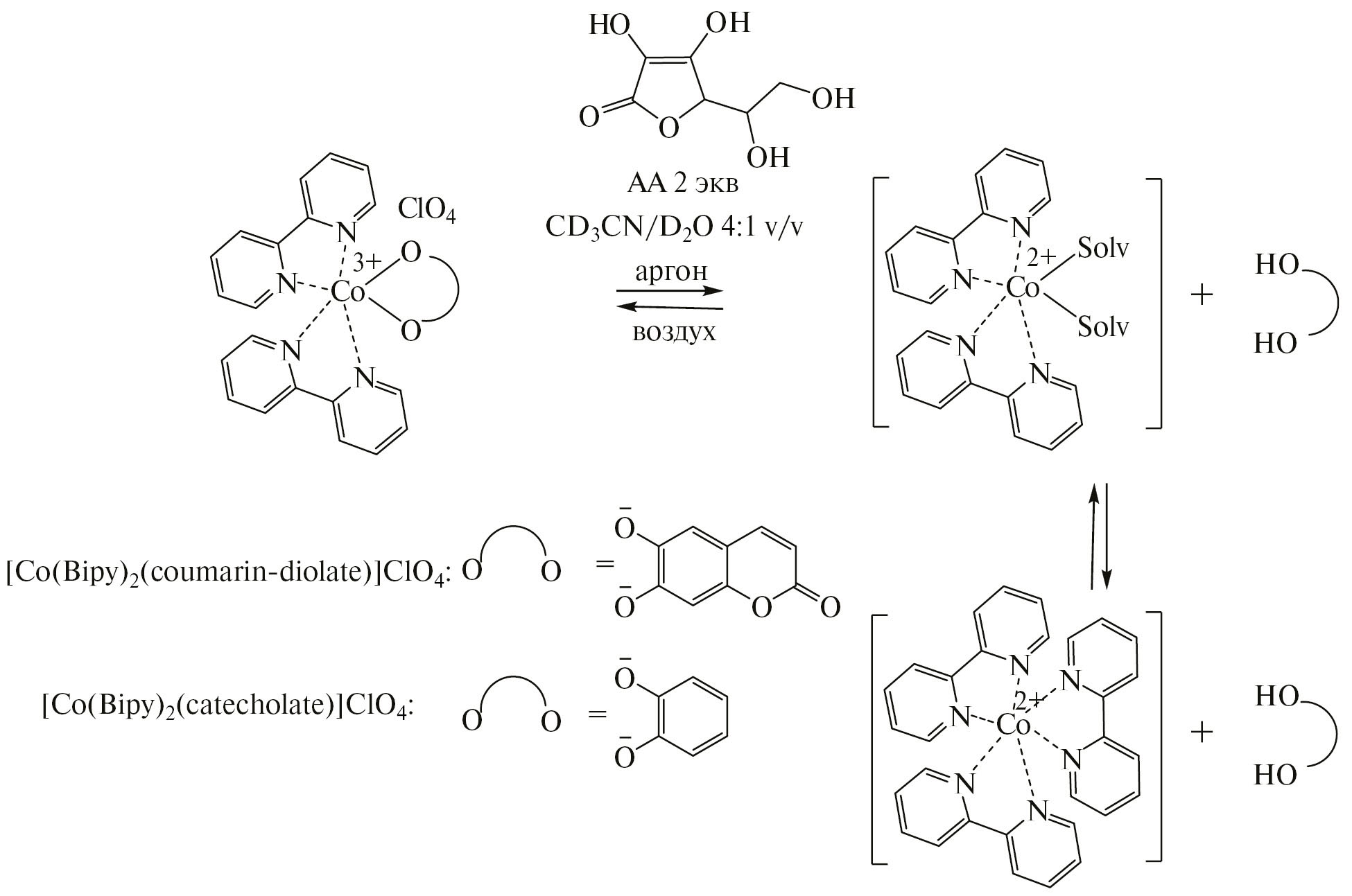 Восстановление гетеролептических комплексов кобальта(III) (схема 2) приводило к изоструктурным комплексам кобальта(II), которые быстро элиминировали дианион 2-оксо-2Н-хромен-6,7-диолат или катехолат, что сопровождалось образованием комплекса кобальта(II) [Co(Bipy)2(Solv)2]2+. Последний в растворе вступал в реакцию обмена лигандами с аналогичными комплексными ионами, в результате чего образовались комплекс [Co(Bipy)3]2+ и сольватированные ионы кобальта [9, 11].