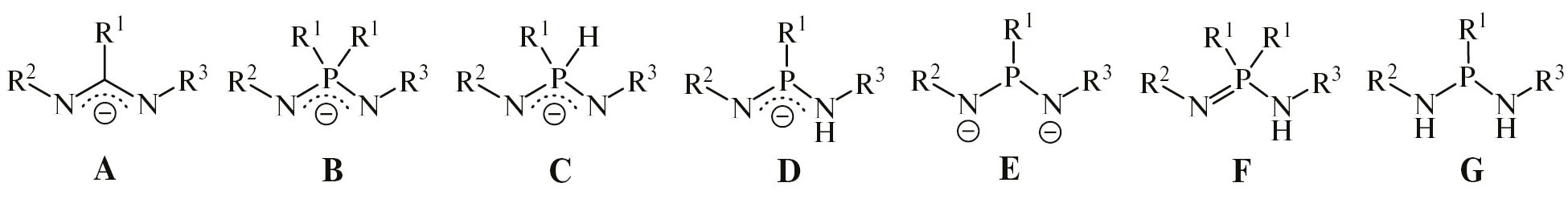 Классический подход к генерации анионов B состоит в депротонировании иминофосфонамидов [R1R2P(=NR3)(NHR4)] (F) сильными основаниями (третичные амины, амиды или гидриды металлов, бутиллитий и т.д.) [9–11]. Однако синтетическим подходом к PH-анионам [R1HP(NR2)(NR3)] (С) является однократное депротонирование фосфиндиамидов [R1P(NHR2)(NHR3)] (G), приводящее к образованию равновесной смеси таутомеров C (PH-форма) и D (NH-форма) (см. схему 1) [12–15].