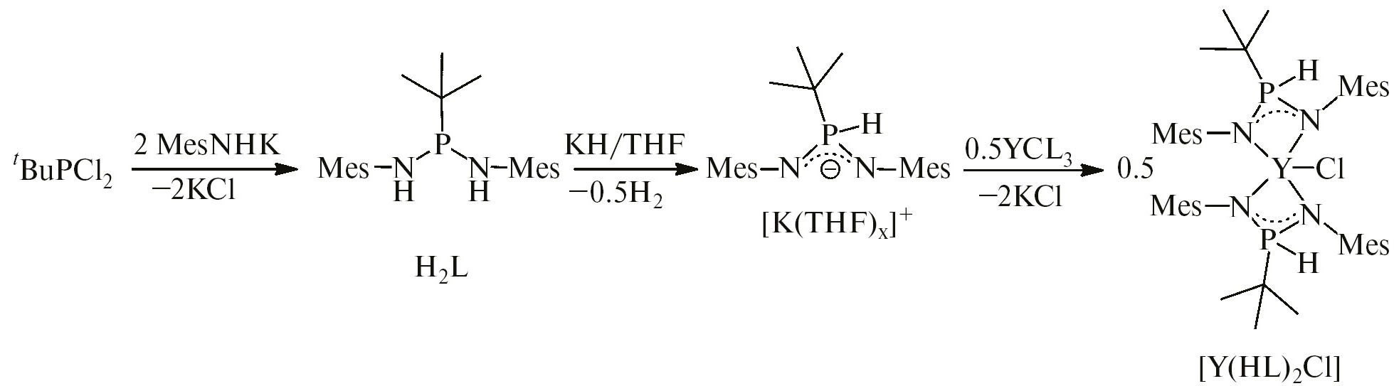 Как и в случае KHL, в ИК-спектре [Y(HL)2Cl] присутствует характеристичная полоса с максимумом при 2306 см–1, соответствующая валентным колебаниям P–H. При этом полосы, характерные валентным колебаниям N–H, отсутствуют. Спектр ЯМР 1H свидетельствует об эквивалентности мезитильных заместителей, трет-бутильных групп и протонов, связанных с фосфором. Последним соответствует дублет с константой расщепления 1JPH = 432 Гц. В спектре ЯМР 31P также присутствует один дублет с такой же константой расщепления. Сигналы, соответствующие протонам NH-групп, не обнаружены.
