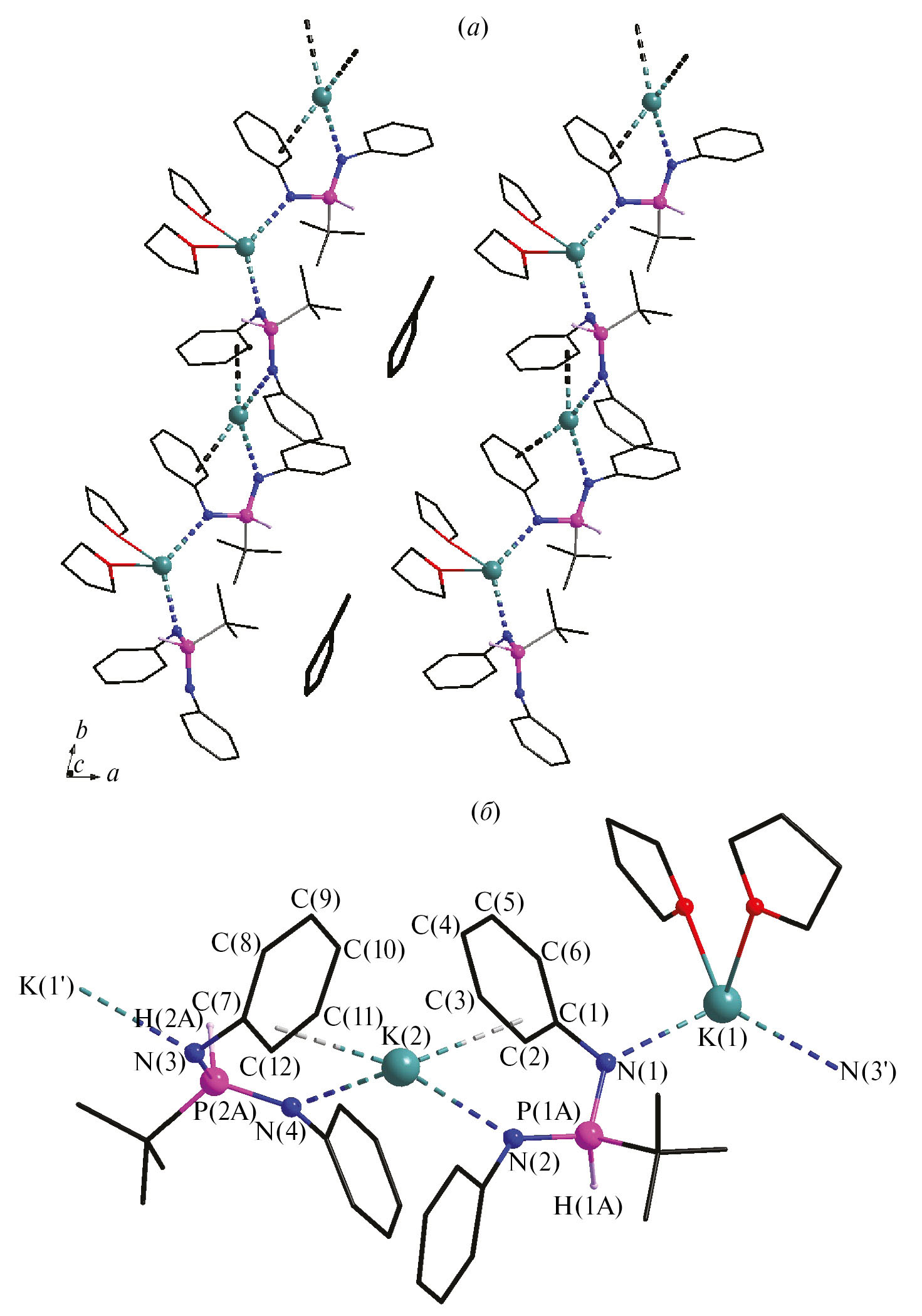 4. Fig. 1. Structure of K[K(THF)2](tBuPH(NMes)2)2 × C7H8 (KHL): packing of chains of alternating HL anions and potassium cations in a crystal (a); structure of the structural block K[K(THF)2](tBuPH(NMes)2)2 (b). CH3 groups of mesityl fragments and hydrogen atoms at carbon atoms are not shown. The contacts of potassium ions with nitrogen atoms and the π system of aromatic cycles are shown in dotted lines.