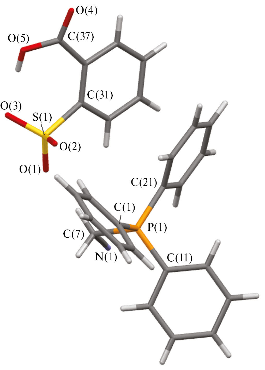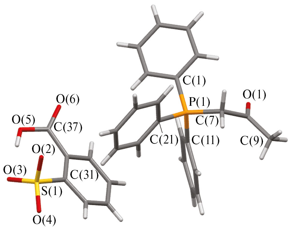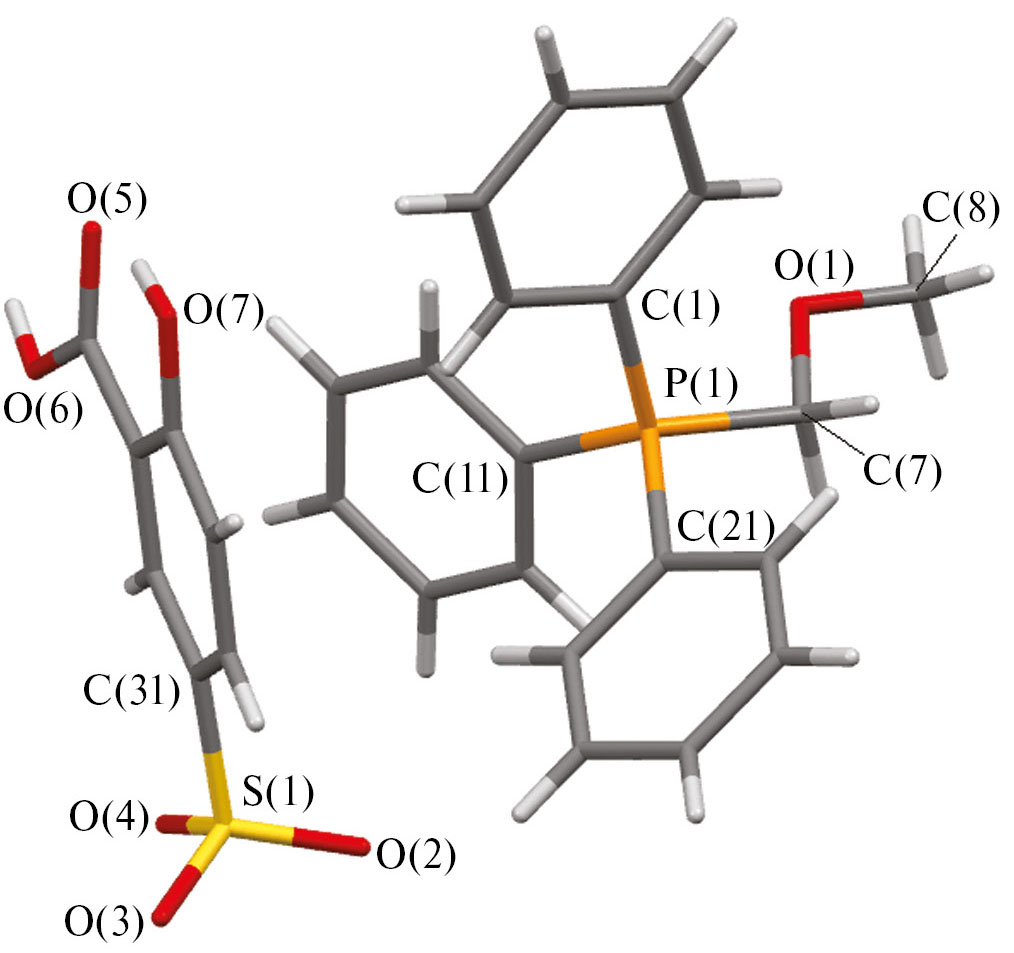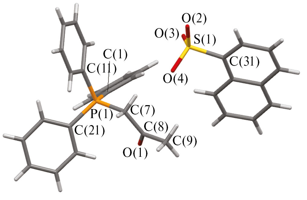 Таким образом, взаимодействием эквимолярных количеств бромида алкилтрифенилфосфония с аренсульфоновыми кислотами в водно-ацетоновом растворе синтезированы новые соли [Ph3PCH2ОMe][OSO2C6H3(OH-4)(COOH-3)] (I), [Ph3PCH2СN][OSO2C6H4(COOH)-2] (II), [Ph3PCH2C(O)Me][OSO2С6H4(COOH-2] (III), [Ph3PCH2C(O)Me][OSO2Naft-1] (IV). По данным РСА, соединения I–IV имеют ионную структуру с тетраэдрическими катионами алкилтрифенилфосфония и аренсульфонатными анионами. В кристалле I наблюдаются прочные водородные связи (S=O···H–OC(O) 1.87 Å), посредством которых аренсульфонатные анионы структурируются в цепочки. Структурная организация кристаллов I–IV формируется за счет множества слабых водородных связей между катионами и анионами.