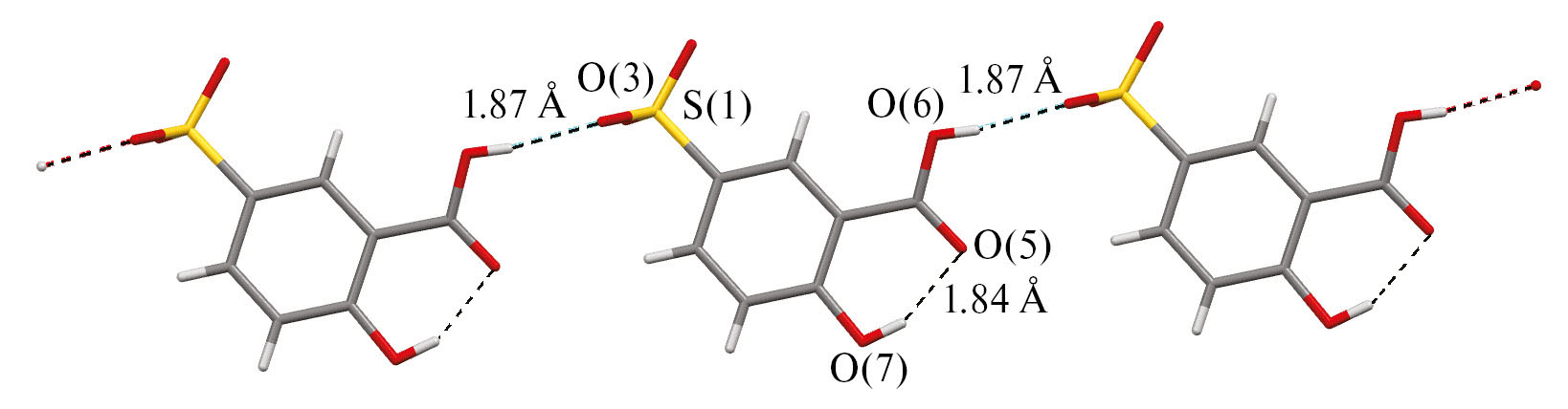 В кристалле I в анионах присутствуют внутримолекулярные контакты О–Н···О=С между водородом гидроксильной группы и атомом карбонильного кислорода, составляющие 1.84 Å, и прочные межионные водородные связи (S=O···H–OC(O) – 1.87 Å), посредством которых аренсульфонатные анионы структурируются в цепочки, между которыми расположены катионы (рис. 5).