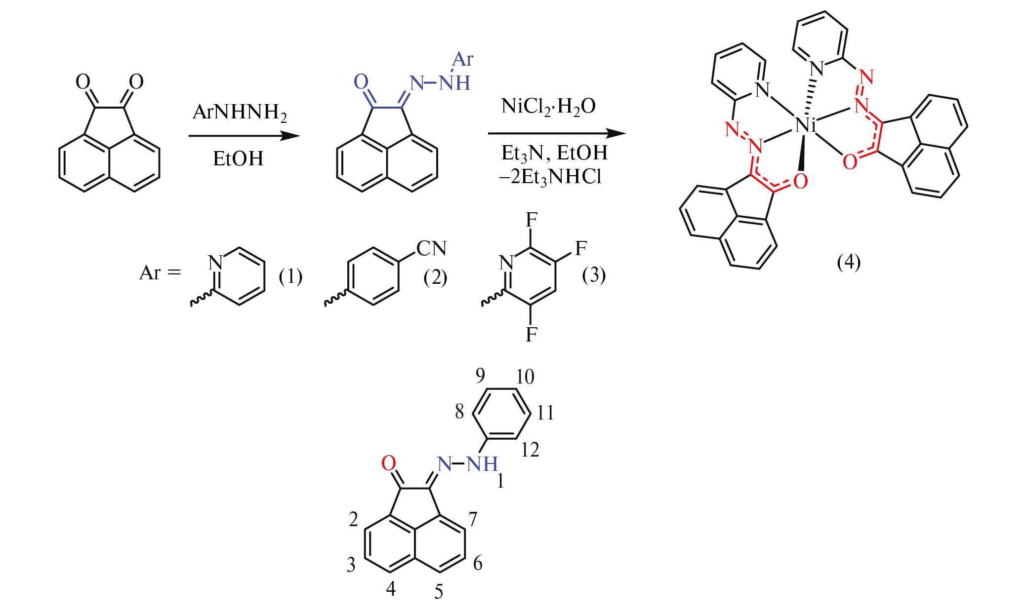 В статье использовали следующие реактивы: аценафтенхинон (Sigma Aldrich, 99%), NiCl2 · 6H2O (Sigma Aldrich, 99%) 4-цианофенилгидразин (Sigma Aldrich, 98%), 2-пиридилгидразин (Sigma Aldrich, 98%), 3,4,6-трифтор-2-пиридилгидразин (Sigma Aldrich, 98%) использовали без предварительной очистки. Растворители очищали по стандартным методикам. ИК-спектры в области 4000–400 см–1 записывали на спектрометре Scimitar FTS 2000 с образцов, запрессованных в таблетки KBr. Элементный анализ на C, H, N, S выполнен на приборе Euro EA 3000. Спектры ЯМР регистрировали на спектрометре Bruker Avance 500 при комнатной температуре с использованием в качестве стандарта для 1Н ЯМР ТМС (внутренний) в CDCl3.