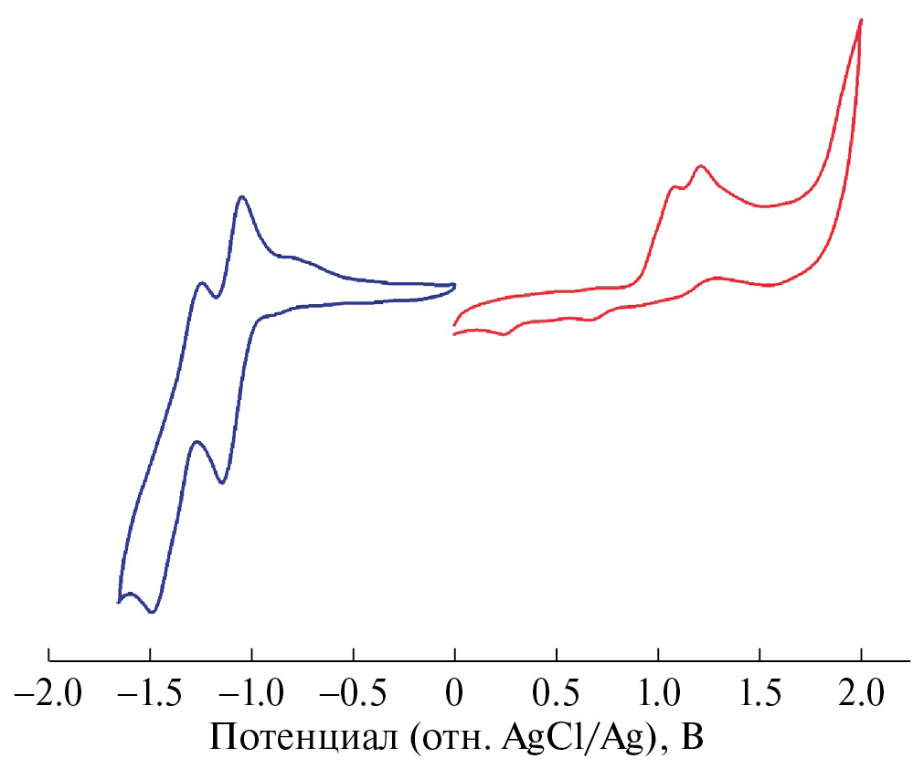 Электрохимические исследования растворов проводили на приборе 797 VA Computrace (Metrohom, Switzerland) с использованием трехэлектродной ячейки объемом 10 мл. В качестве вспомогательного электрода использовали платиновый электрод, в качестве электрода сравнения – хлорсеребряный электрод, заполненный KCl (3M). В качестве рабочего электрода использовали стеклоуглеродный дисковый электрод (d = 3 мм). В качестве фонового электролита использовали 0.1 M раствор Bu4NPF6 в дихлорметане, скорость сканирования 100 мВ/с. В качестве внутреннего стандарта использовали ферроцен с потенциалом E1/2 = 0.49 В (отн. Ag/AgCl). Концентрации варьировались в пределах 8 × 10–4 – 2 × 10–3 M. Потенциал полуволны (E1/2) рассчитывали как полусумму потенциалов анодного и катодного пиков.