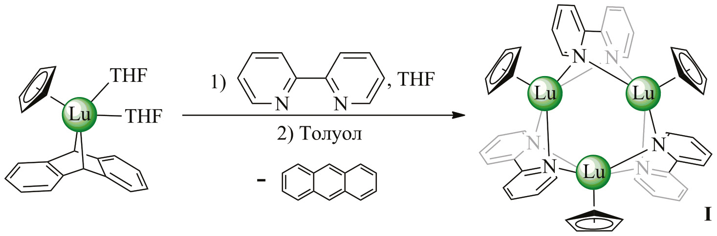 Добавление бипиридина к циклопентадиенил-антраценидному комплексу лютеция [CpLu(C14H10)(THF)2] в среде ТГФ приводит к моментальному изменению цвета смеси с характерного темно-красного на темно-коричневый (схема 1). Упаривание ТГФ из реакционной смеси в вакууме приводит к порошку, содержащему комплекс [CpLu(Bipy)]3 (I). Перекристаллизация порошка из смеси толуол/гексан приводит к образованию микрокристаллов соединения I · 0.1(C14H10) · 0.8(C7H8) (данные ЯМР 1H), состав которого подтвержден результатами элементного анализа. Выделенный порошок имеет среднюю растворимость в ТГФ и толуоле, но не растворяется в гексане. Попытки избавиться от антрацена в сокристаллизате I · 0.1(C14H10) · 0.8(C7H8) переосаждением или перекристаллизацией не увенчались успехом.
