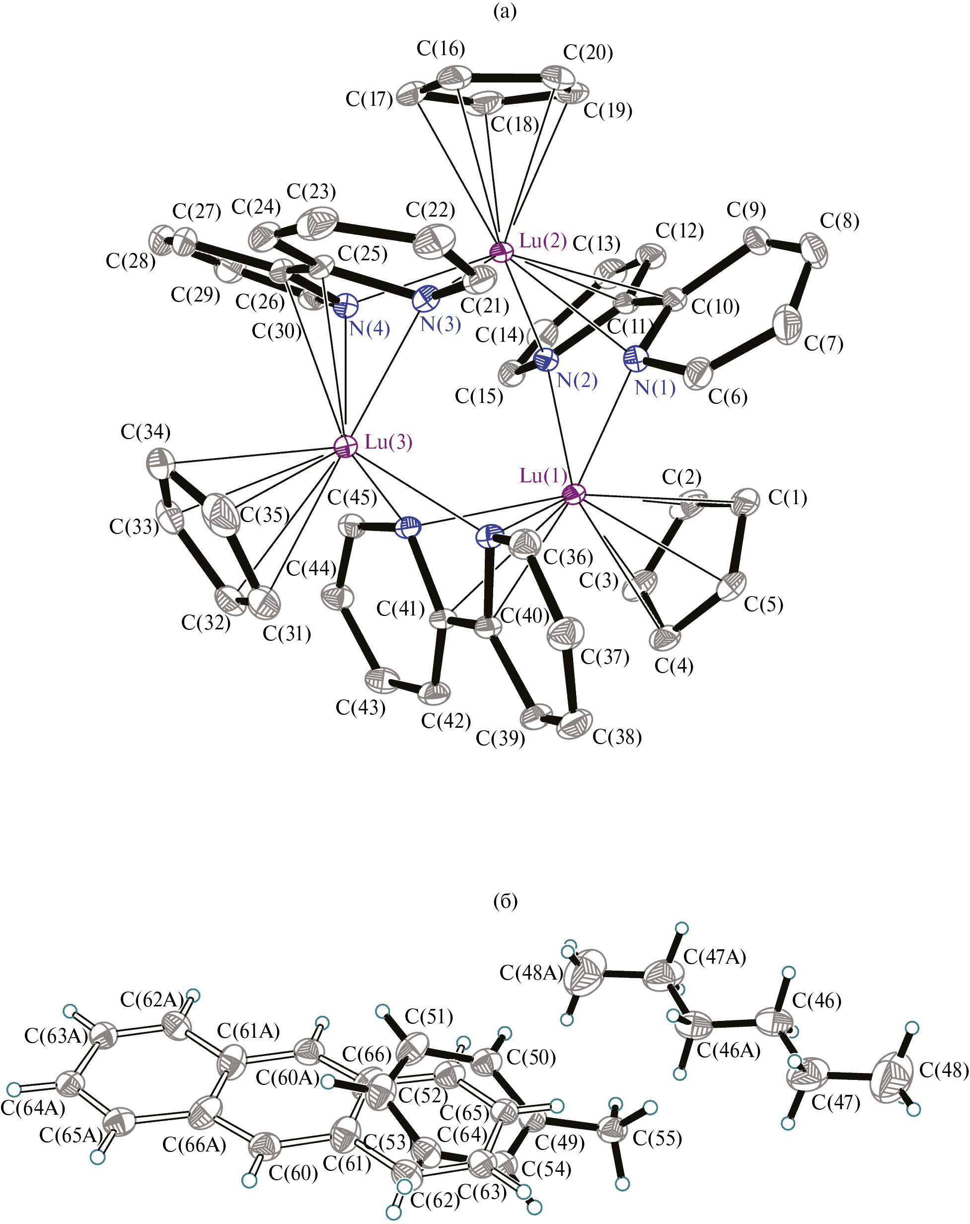Рис. 1. Молекулярное строение {[(η⁵-C₅H₅)Lu]₃ [μ₂-κ²N¹,N¹´:η4N¹,C²,C²´,N¹´-Bipy]₃} (I): атомы ((а), атомы водорода не показаны) и некоординирующие органические молекулы (б), минорный компонент разупорядоченности — антрацен — показан с помощью не закрашенных линий) в I · 0.084(C₁₄H₁₀) · 0.831(C₇H₈) · 0.500(C₆H₁₄) (p = 50%).