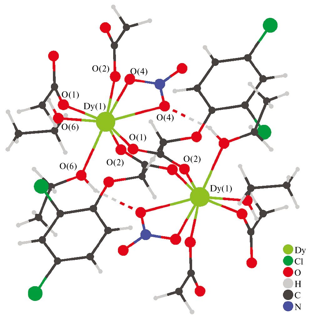 Соединение диспрозия VI кардинально отличается составом от вышеописанных. Координационный полиэдр центрального атома имеет геометрию квадратной антипризмы с координационным числом центрального атома, равным 8 (рис. 3). Два карбоксилат-аниона выполняют бидентатно-мостиковую функцию, нитрат-анион координирован бидентатно. Два остальных места в координационном полиэдре заняты молекулами этанола. Все это приводит к увеличению расстояния между катионами диспрозия до 4.890 Å. Координационный полимер имеет линейное зигзагообразное строение.