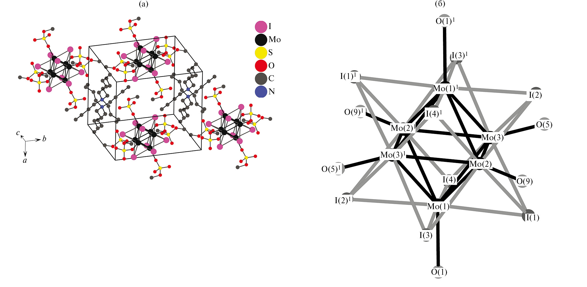 Фрагмент кристаллической решетки показаны на рис. 1a. В кристалле I отсутствуют сольватные молекулы и специфические взаимодействия между частицами, пространство равномерно заполнено электростатически взаимодействующими кластерными анионами и тетрабутиламмонийными катионами. Каждый атом молибдена монодентатно координирован шестью лигандами через атом кислорода метилсульфатного лиганда, что является типичным способом координации лигандов в комплексах вида [{M6X8}L6] (M = Mo, X = галоген), независимо от количества и типа донорных атомов лигандов. Среднее расстояние Mo–O в I составляет 2.14 Å, что сопоставимо со средними расстояниями Mo–O (2.13 Å) в тозилатном комплексе (Bu4N)2[Mo6I8(O3SC6H4CH3)6] · 2Et2O · 2CH3CN [30] со средними расстояниями Mo–O (2.11 Å) в сольватах тозилатных хлоридных комплексов (Bu4N)2[Mo6Cl8(O3SC6H4CH3)6] · 2CH3CN и (Bu4N)2[Mo6Cl8(O3SC6H4CH3)6] · CH2Cl2 [31] и со средними расстояниями Mo–O (2.17 Å) в трифлатном комплексе (Bu4N)2[Mo6I8(O3SCF3)6] · · CH2Cl2 [4]. Расстояния Mo–Mo, Mo–I в комплексе I приведены в табл. 1 и являются характе́рными расстояниями для кластерных ядер типа {Mo6I8}4+ [30, 32, 33] (рис. 1б).