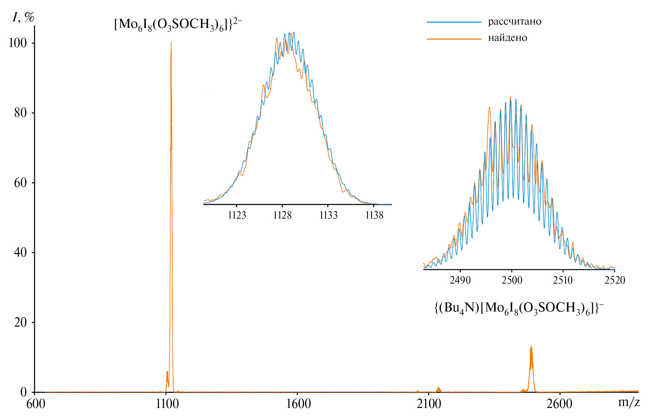 Известно, что такие лиганды, как трифлат CF3SO3–, и тозилат (пара-толуолсульфонат, Pts) CH3C6H4SO3– являются лабильными, поэтому следовало ожидать схожую лабильность и для метилсульфатных лигандов в растворах комплекса I по отношению к донорным растворителям. В ацетонитриле не происходит немедленного замещения метилсульфатных лигандов, в электроспрей-масс-спектре в области отрицательных значений m/z ацетонитрильного раствора I наблюдаются сигналы (с максимумами в изотопных распределениях при 1129.7 и 2500.9), соответствующие комплексу [Мо6I8(O3SОCH3)6]2– и ионному ассоциату {(Bu4N)[Мо6I8(O3SОCH3)6]}–; на рис. 2 показано наложение найденных и рассчитанных изотопных распределений для указанных анионов.