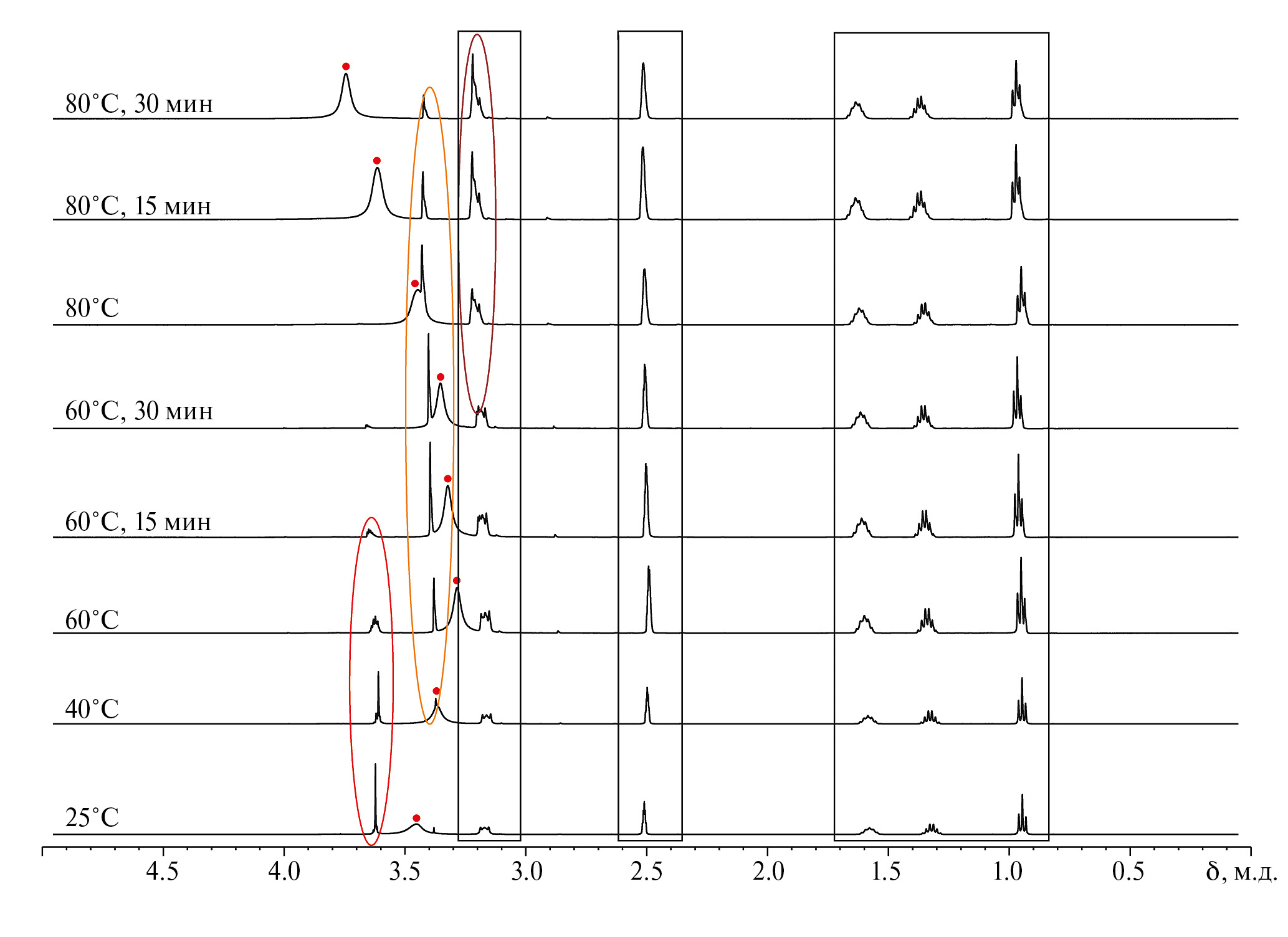 Рис. 3. Спектры ПМР I в ДМСО-d6 при разных температурах. Химические сдвиги сигналов от протонов катионов Bu4N+ и ДМСO (2.5 м.д.) отмечены прямоугольниками; красным овалом внутри прямоугольника — от метильных протонов молекул метанола; оранжевым овалом — от протонов свободных метилсульфатных анионов; красным овалом — от протонов координированных метилсульфатных анионов; мигрирующий (в диапазоне 3.31–3.74 м.д.) уширенный сигнал, отмеченный красной точкой, отнесен к протонам H2O