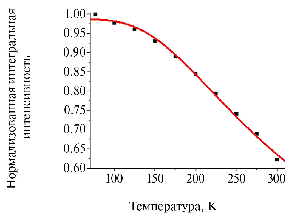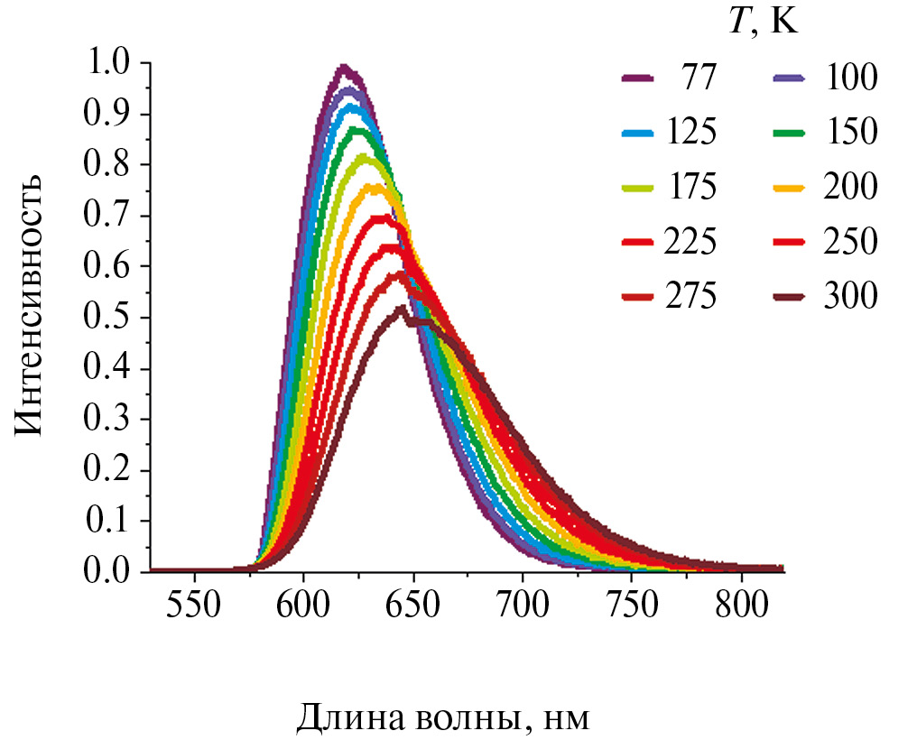 где I0 – не зависящая от температуры интенсивность, С — безразмерный параметр и ΔE — энергия активации термического тушения люминесценции, ΔE = 700 K (487 см–1) (рис. 6). Квантовый выход люминесценции I составляет 29% при 300 К и возбуждении длиной волны 440 нм. Обычно тушение фосфоресценции кислородом происходит гораздо сильнее для растворных образцов, чем для образцов в твердом состоянии, что может быть связано с тем, что диффузия молекул кислорода к люминесцентным центрам в твердом веществе более затруднена, чем в растворах. Например, в случае комплексов (Bu4N)2[M6I8 (CF3COO)6] (M = Mo, W), растворенных в насыщенных кислородом воздуха ацетонитрильных растворах, тушение люминесценции происходит практически полностью, тогда как квантовые выходы люминесценции чистых поликристаллических образцов достигают 4% (W) и 12% (Mo) [5]. Различие же размеров частиц (агломератов) на макроскопическом уровне (сотни микрометров) в порошковых образцах не оказывает влияния на тушение люминесценции кислородом воздуха согласно данным экспериментов по измельчению, проверки размеров частиц (сканирующим электронным микроскопом) в сочетании с повторными спектроскопическими измерениями [4].