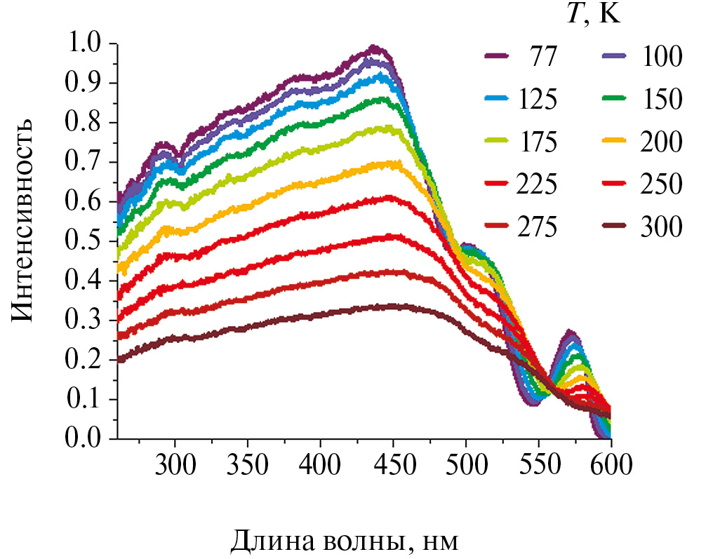 Рис. 4. Температурная зависимость люминесценции порошкового образца I при возбуждении λеx = 440 нм