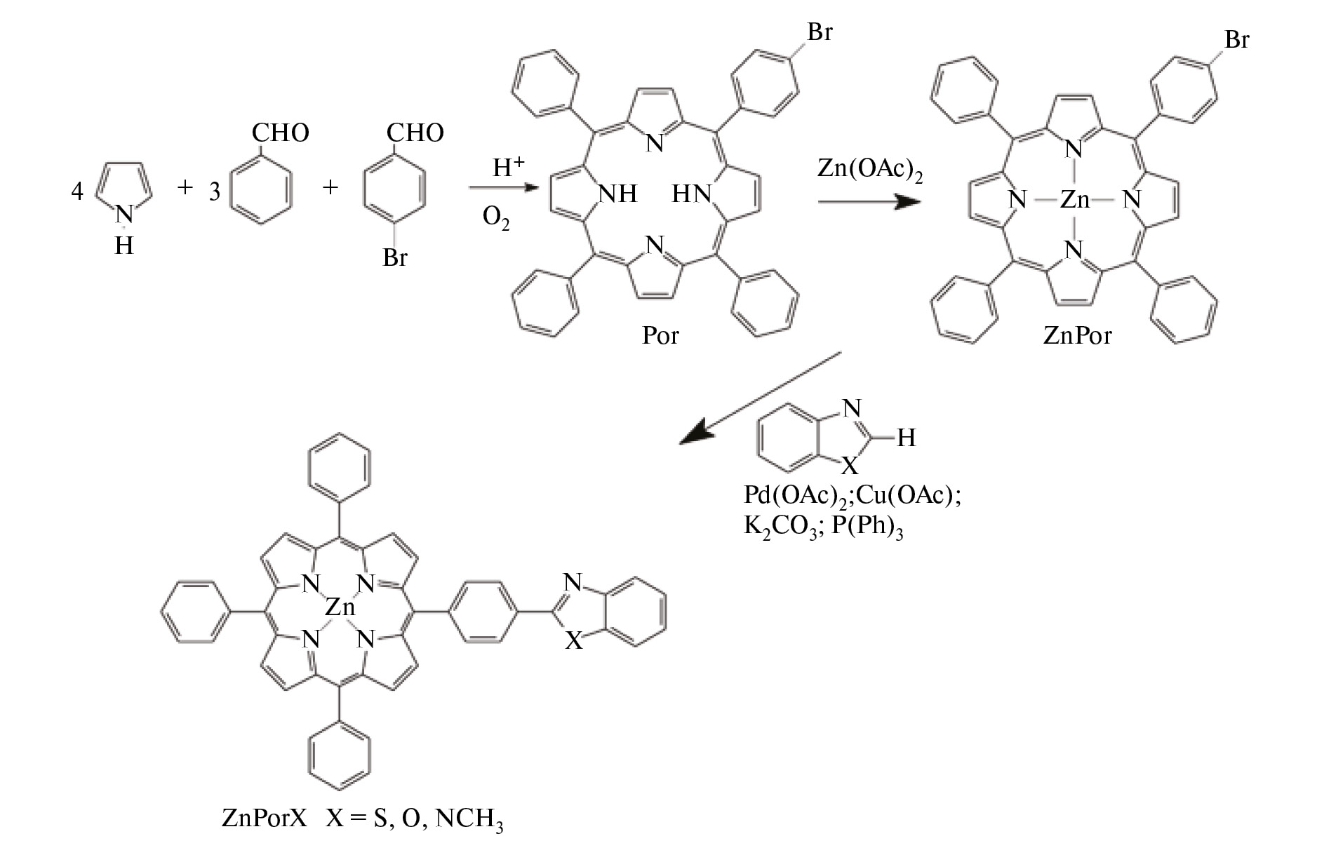 Для синтеза несимметричных гетерилзамещенных порфиринов ZnPorХ (Х = S, O, N) исходным соединением служил несимметричный Pоr, который был получен “смешанно-альдегидной“ конденсацией бензальдегида и 4-бромбензальдегида (соотношение 3 : 1) с пирролом (схема 1). Реакцию проводили в кипящей смеси изомерных ксилолов с добавкой трифторуксусной кислоты (1%) в качестве катализатора. Первую стадию реакции (образование порфириногена) проводили в инертной атмосфере, вторую (окисление порфириногена до порфирина) — в токе кислорода воздуха. Образующаяся смесь порфиринов была разделена с помощью двукратной колоночной хроматографии на окиси алюминия. Далее бромзамещенный порфирин переводили в ZnPor аналогично [21]. Затем по разработанным нами ранее методикам [22] проводили палладий-катализируемое сочетание бромзамещенного порфирината цинка(II) с гетероциклом (бензотиазолом, бензоксазолом, N-метилбензимидазолом). В качестве каталитической системы использовали Pd(OAc)2/Cu(OAc)2 (20/20 мол. %) в присутствии трифенилфосфина в качестве лиганда и K2CO3 в качестве основания. Реакции каталитического гетерилирования протекали в течение 30 ч с образованием гетерилпорфиринов ZnPorХ (Х = S, O, N). Следует отметить, что, несмотря на более кислый характер связи С–Н в молекуле бензоксазола и, следовательно, бо`льшую реакционную способность, выход ZnPorO наиболее низкий (64%), в отличие от бензоксазолзамещенного трипиридилпорфирина, синтезированного нами ранее [11]. Очистку несимметричных гетерилпорфиринов ZnPorХ проводили с помощью колоночной хроматографии на силикагеле, используя в качестве элюента последовательно: смесь гексан–хлористый метилен (1 : 1), затем хлористый метилен.