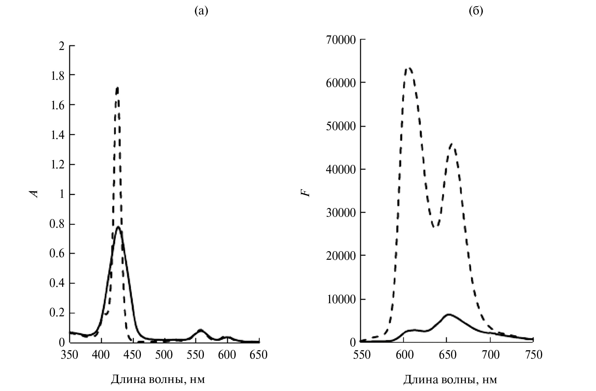 Рис. 1. ЭСП ZnPorO (8.2 x 10–6 М) (а) и его спектр флуоресценции (б) в ДМФА (пунктирная линия) и PBS-ДМФА (0.19 М) (сплошная линия).